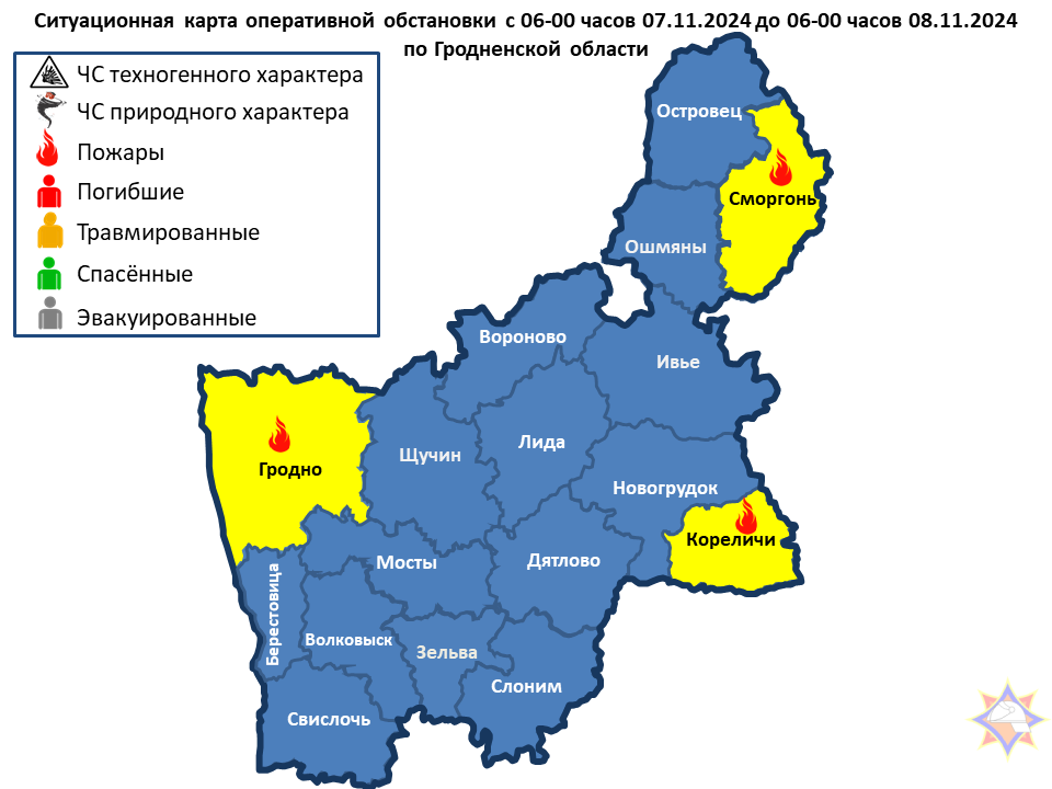 Произошло 3 пожара: Гродненский район - пожар жилого дома, Кореличский район - пожар жилого дома, г. Сморгонь – загорание легкового автомобиля. Люди не пострадали.