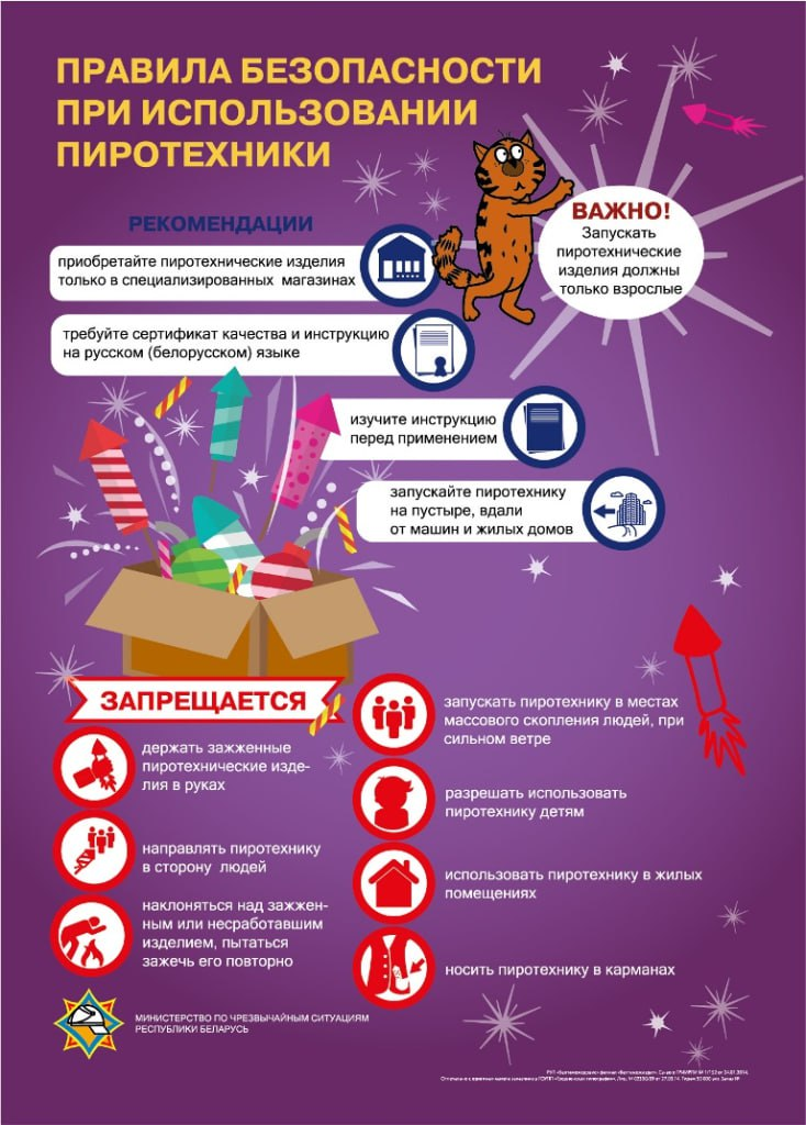 - При закупке пиротехнических изделий обращайте внимание на сроки годности, а инструкция по применению должна быть на русском или белорусском языке; требуйте у продавца сертификат соответствия пиротехнического изделия.