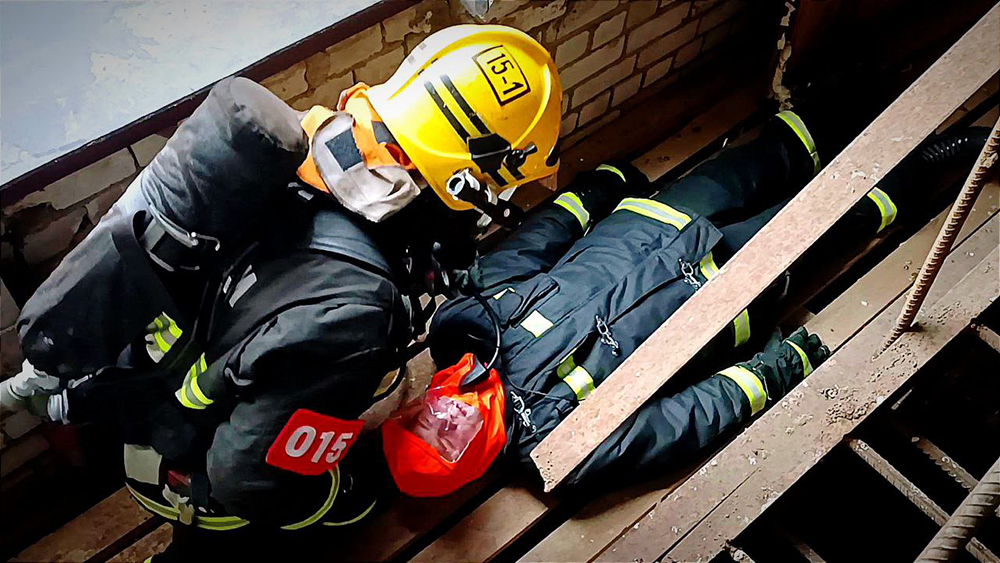 Этаж, еще один и еще, и вот спасатели уже у цели. На 4 этаже находится пострадавший без сознания. Кислородная маска, страховка, спуск, и вот спасатели с пострадавшим уже на земле.