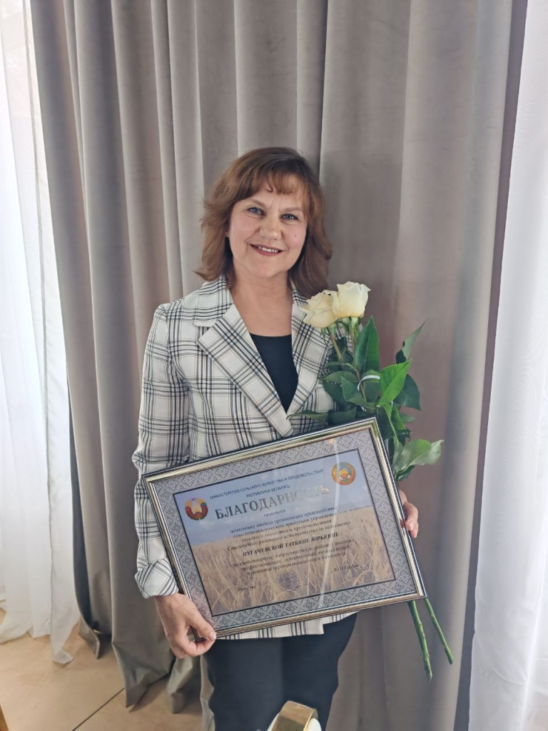 Высокой награды за плодотворную добросовестную работу, высочайший профессионализм, значительный личный вклад в развитие агропромышленного комплекса удостоена начальник отдела организации производства сельскохозяйственной продукции управления сельского хозяйства и продовольствия райисполкома Татьяна Пугачевская – ей объявлена благодарность министра сельского хозяйства и продовольствия Республики Беларусь Юрия Горлова.