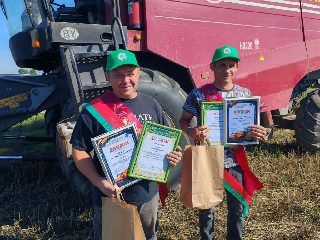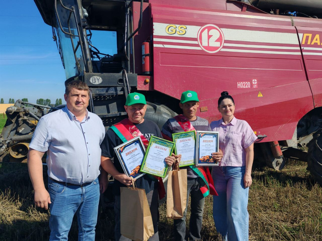 Председатель райисполкома Андрей Грицкевич, председатель райкома Белорусского профсоюза работников АПК Татьяна Борель вручили заслуженные награды экипажу-«тысячнику» сельхозпредприятия комбайнеру Вадиму Гутору и помощнику комбайнера Сергею Ковалику. Также наград были удостоены операторы КЗСВ-30 Валерий Степанюк, Александр Войтеховский и Сергей Курзяков, которые на сегодняшний день переработали 4 000 тонн зерновых культур. Хлеборобам вручили дипломы и денежные вознаграждения районной организации отраслевого профсоюза АПК.