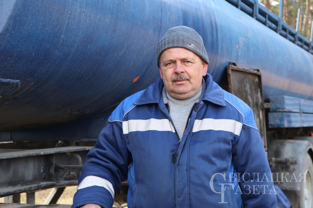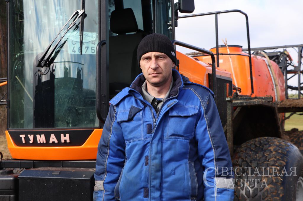 Тут же ждал своего часа МАЗ с цистерной, который подвозит на поле КАС. Им управляет опытный водитель с 42-летним стажем Казимир Лопошко. Кстати, Казимир Генрихович – водитель-ас. Он легко управляет и загрузчиком, и ГАЗ-53, и автомобилем УАЗ. Профессионала задействуют везде, где нужны его опыт и мастерство, рассказал главный инженер Илья Вербицкий.