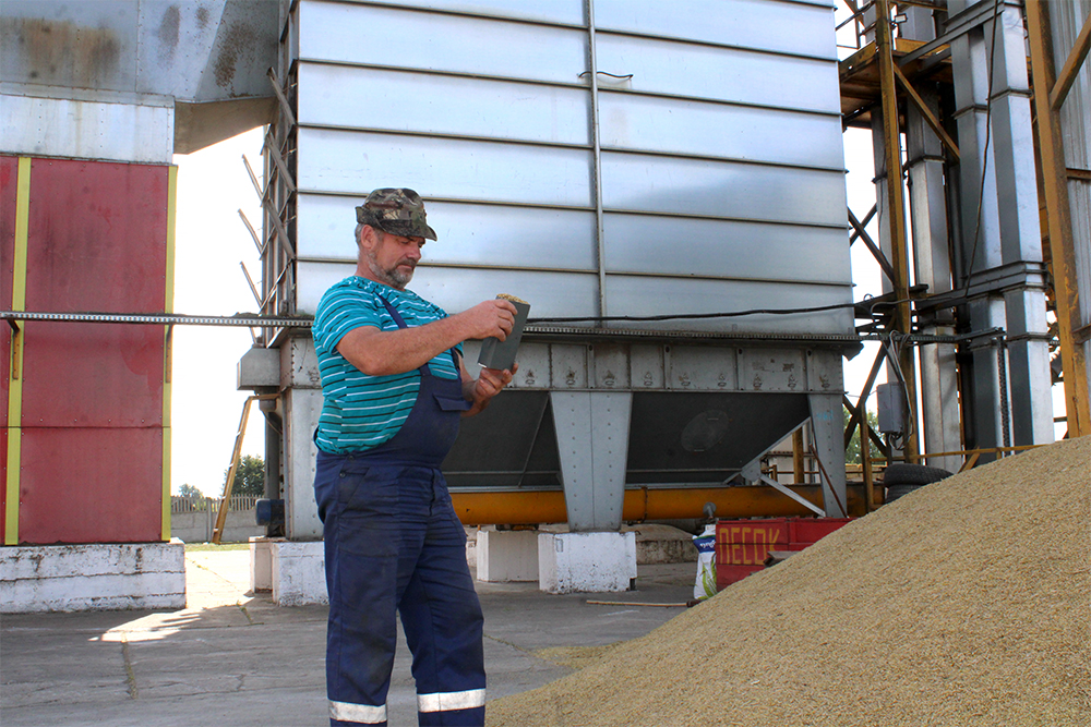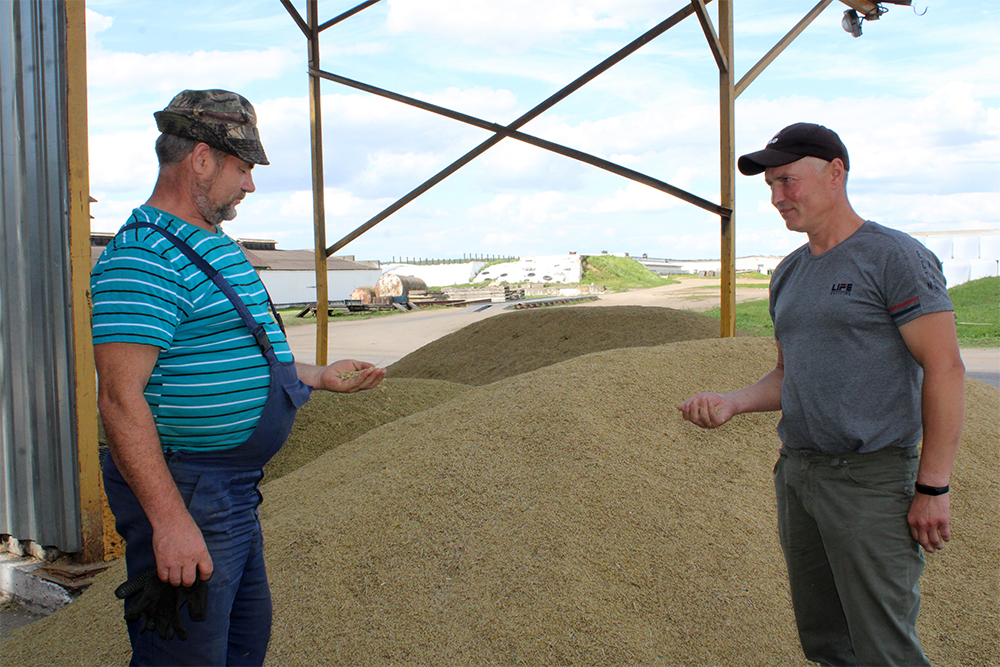За процессом доработки зерна машинисты следят посменно, но если нужна помощь, готовы в любое время дня и ночи подставить дружеское плечо. Ведь процесс не должен останавливаться ни на минуту. В день нашего приезда дежурил Сергей Курзяков, но когда понадобилась помощь коллеги, приехал Александр Войтеховский, несмотря на то, что отработал ночную смену. Их звено сложилось порядка пятнадцати лет назад, в хозяйстве они трудятся в два раза больше. Зимой работают операторами газовой котельной, а в уборочную отвечают за доработку зерна.