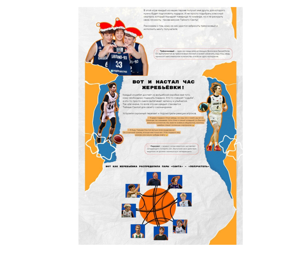 Героями истории «Баскетбольные каникулы» о невероятно красивой игре, достижениях баскетбольного клуба «Принеманье», будущем молодых игроков глазами их тренера и атмосфере новогоднего чуда стали семь ребят из команды «Гродно-93-ГрГУ» и главный тренер Артур Александрович Орловец! О том, кому из них удалось забросить трёхочковый и исполнить мечту, читайте здесь!