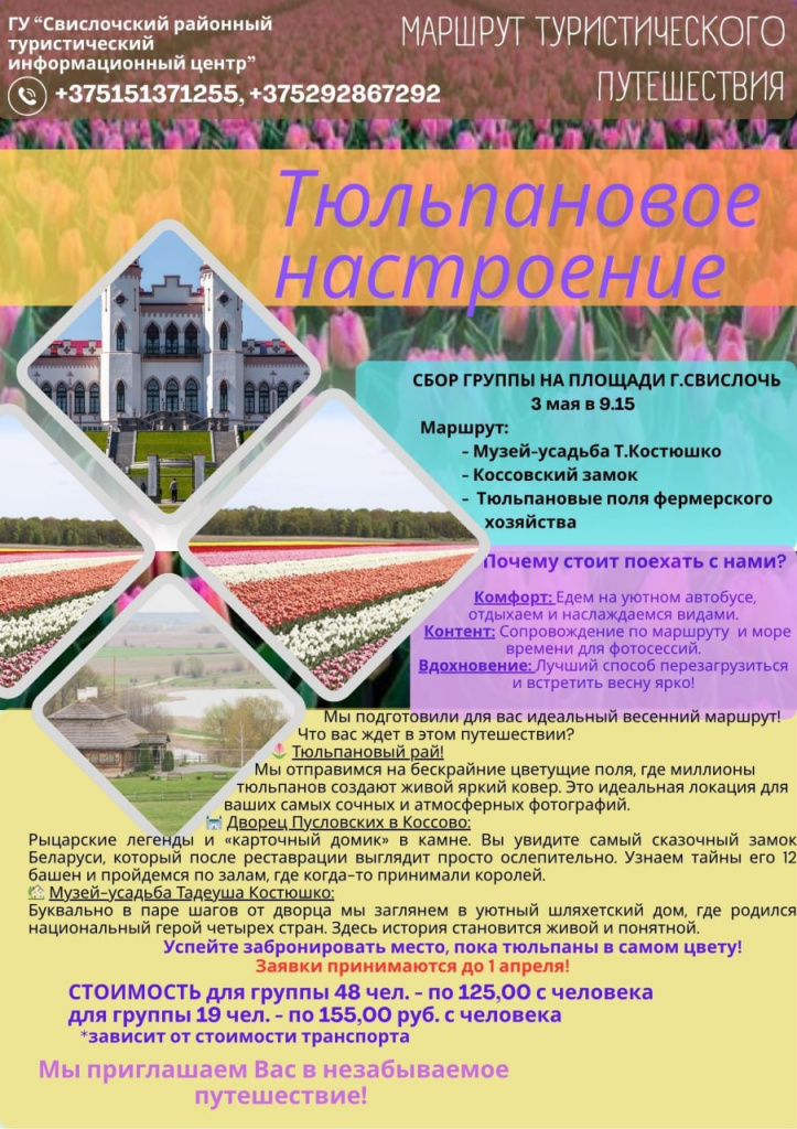 Программа включает посещение музея-усадьбы Тадеуша Костюшко, экскурсию по Коссовскому замку, а также прогулку по тюльпановым полям фермерского хозяйства.