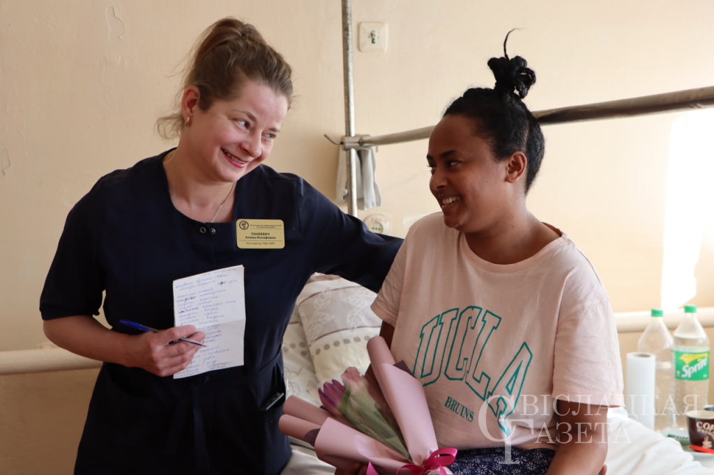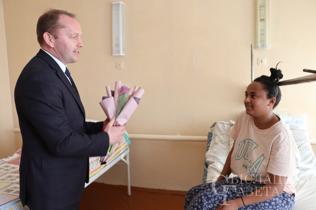 Поздравить гражданку Эритреи, оказавшуюся в сложной ситуации, с 8 Марта и подарить ей вместе с прекрасным букетом праздничное настроение пришел заместитель председателя райисполкома Юрий Куликов. Он нашел с девушкой общий язык – английский. Юрий Валентинович пожелал Лювам выздоровления и воссоединения со своей семьей.