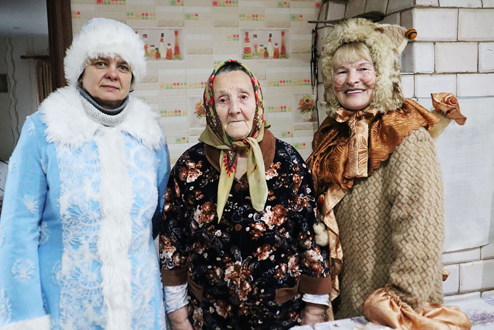 Сапраўдным падарункам стаў для былых настаўнікаў візіт такога вясёлага калектыву, дзе гучалі і смех, і добрыя словы, і пажаданні. Ніна Іванаўна і Барыс Віктаравіч Дзідзенка пахваліліся сваёй навагодняй елачкай, з задавальненнем успомнілі маладыя гады, калі і самі неаднойчы былі ў ролях зімніх герояў. Ганна Пятроўна Лукашэвіч нават прачытала вершы.