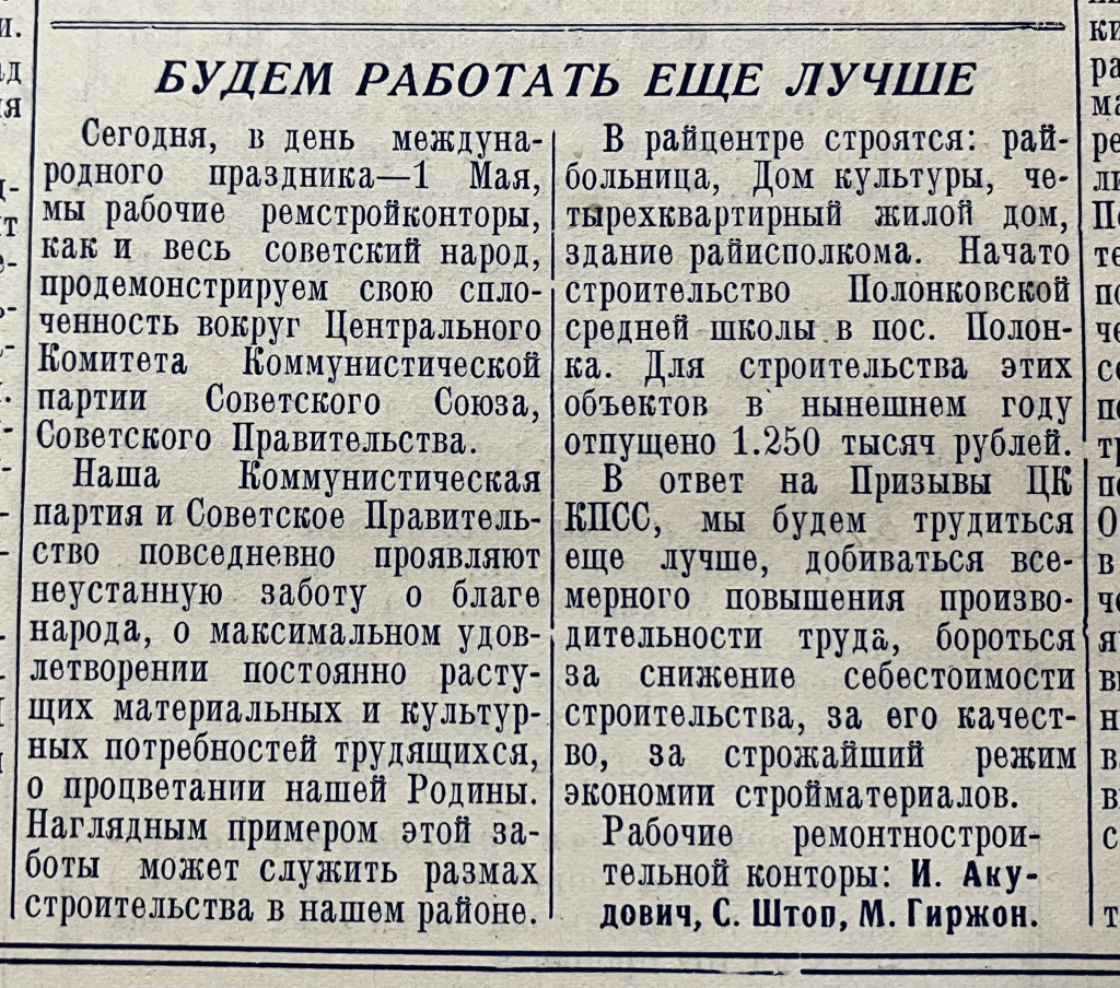 К 1 Мая, международному празднику труда, в №36 вышла статья «Будем работать еще лучше». В ней рассказывается о результатах, с которыми трудящиеся района встречают Первомай 1953 года. «В райцентре строятся: райбольница, Дом культуры, четырехквартирный жилой дом, здание райисполкома. Начато строительство Полонковской средней школы в пос. Полонка», – говорится в статье.
