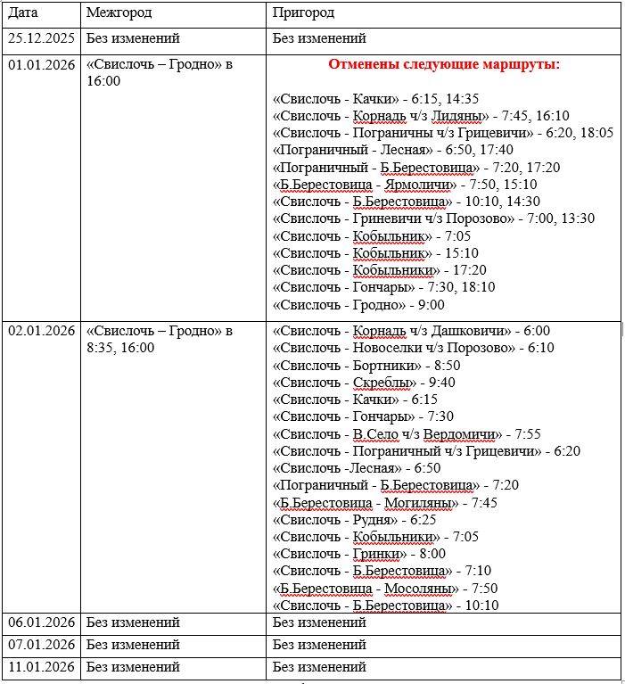 «Уважаемые пассажиры!!! Филиал «Автобусный парк №4 г. Волковыск» ОАО «Гроднооблавтотранс» предоставляет информацию о работе пригородного и междугородного транспорта в период с 25.12.2025 г. по 07.01.2025 г.