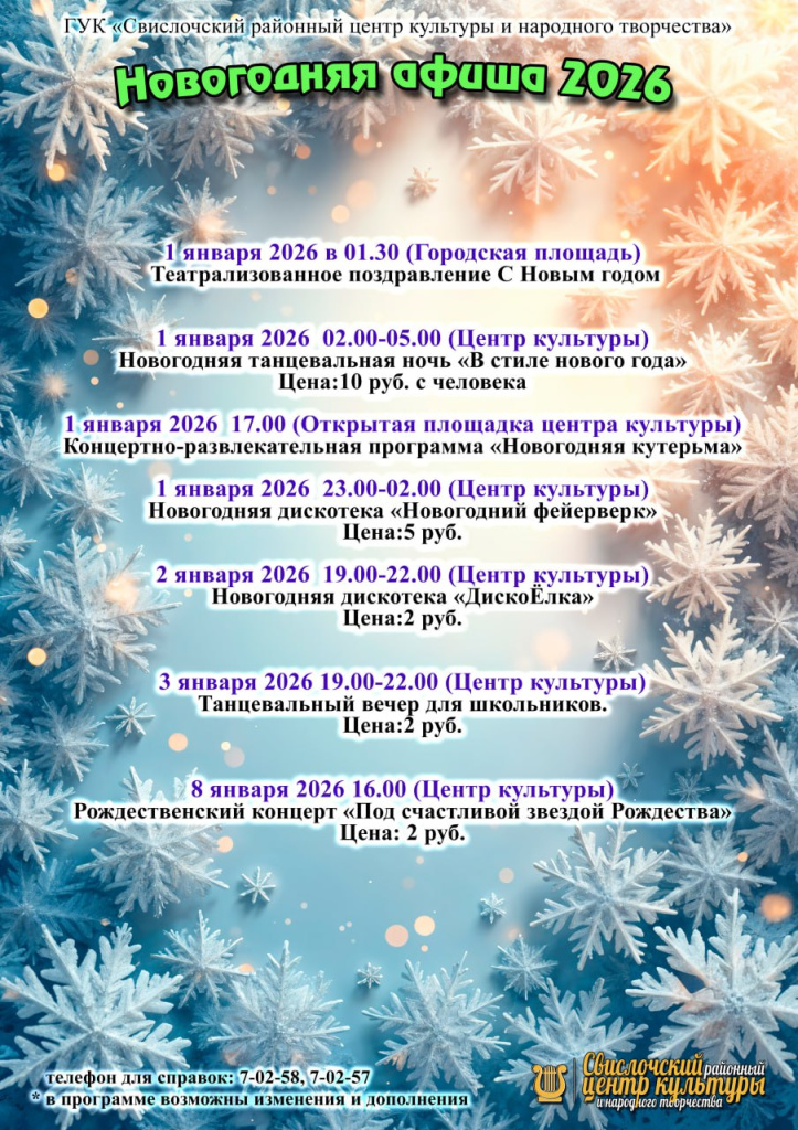 2 января с 19:00 до 22:00 центр культуры приглашает на новогоднюю дискотеку. Вход – 2 рубля.