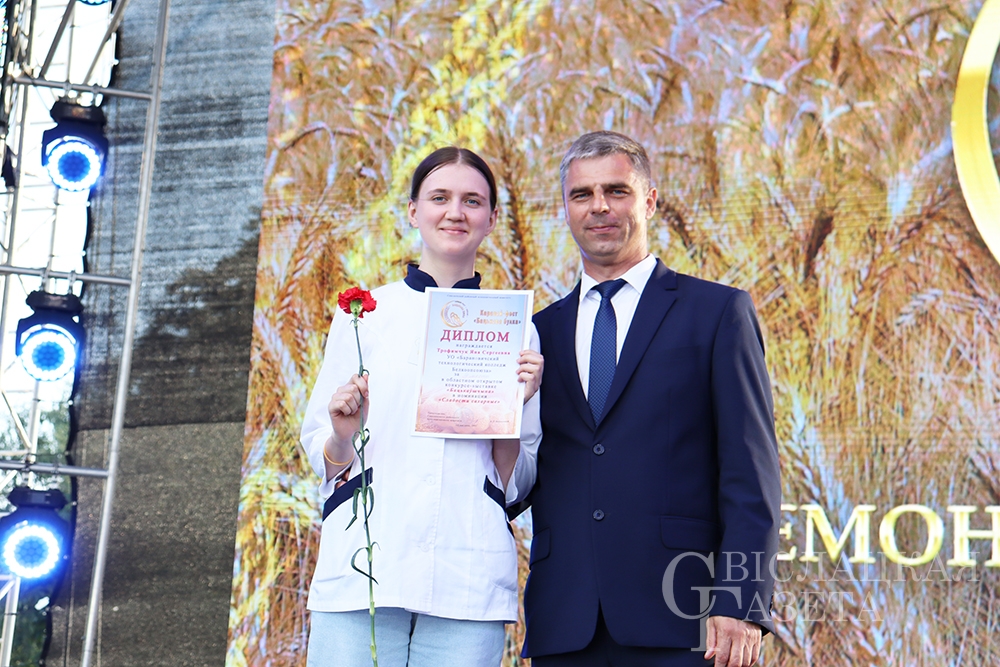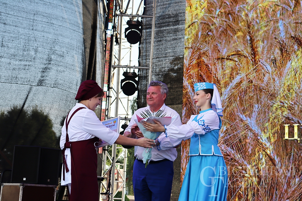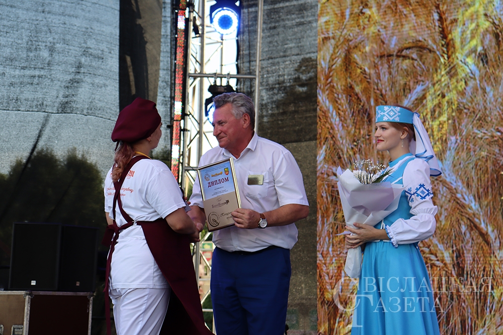 Идем дальше. На сцену для вручения наград в конкурсе хлебобулочных изделий «Бацькаўшчына» поднялся гендиректор ОАО «Гроднохлебпром» Виктор Леонович. Надо отметить, что в этом состязании участвовало 11 конкурсантов. И вот итог. Юлия Парфенова (ОАО «Гроднохлебпром»), Татьяна Ганичевская (Волковысский хлебозавод), Наталья Булыко (Новогрудский хлебозавод), Светлана Лузгачева (Лидский хлебозавод) и Валентина Пашкевич (Сморгонский хлебозавод) отмечены поощрительными премиями. Дипломы III степени завоевали Наталья Лукуть (Волковысский хлебозавод) и Наталья Гисич (Сморгонский хлебозавод). Ольга Зданович (Слонимский хлебозавод) и Людмила Половинская (Новогрудский хлебозавод) увезли с каравай-феста дипломы II степени. Наталья Азевич (Лидский хлебозавод) будет вспоминать «Бацькаву булку», глядя на заслуженный здесь диплом I степени. Евгений Гаравский, представляющий ОАО «Гроднохлебпром», чуть дольше своих коллег задержался на сцене. Он – обладатель сразу двух наград: Гран-при и приза зрительских симпатий.