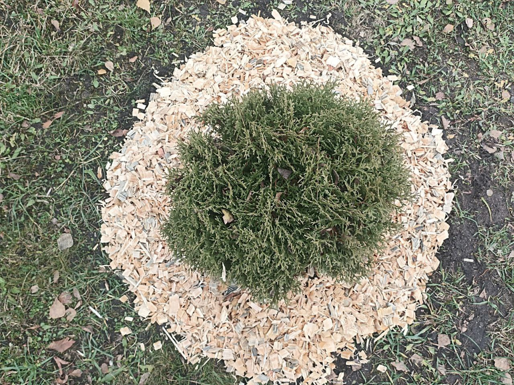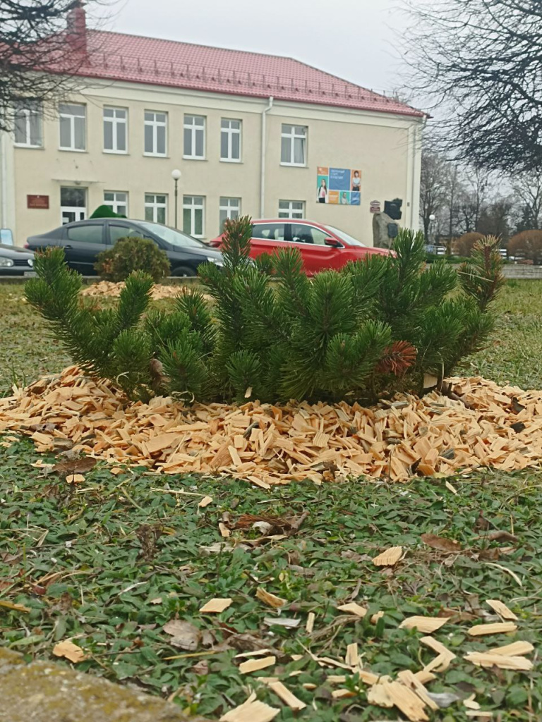 Каждый декоративный куст рабочие участка благоустройства РУП ЖКХ подсыпали щепой. Мульчирование щепой не только позволяет сохранению тепла и задержанию влаги, но и придает ландшафту эстетичный вид.
