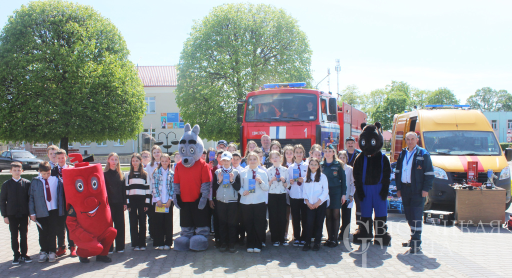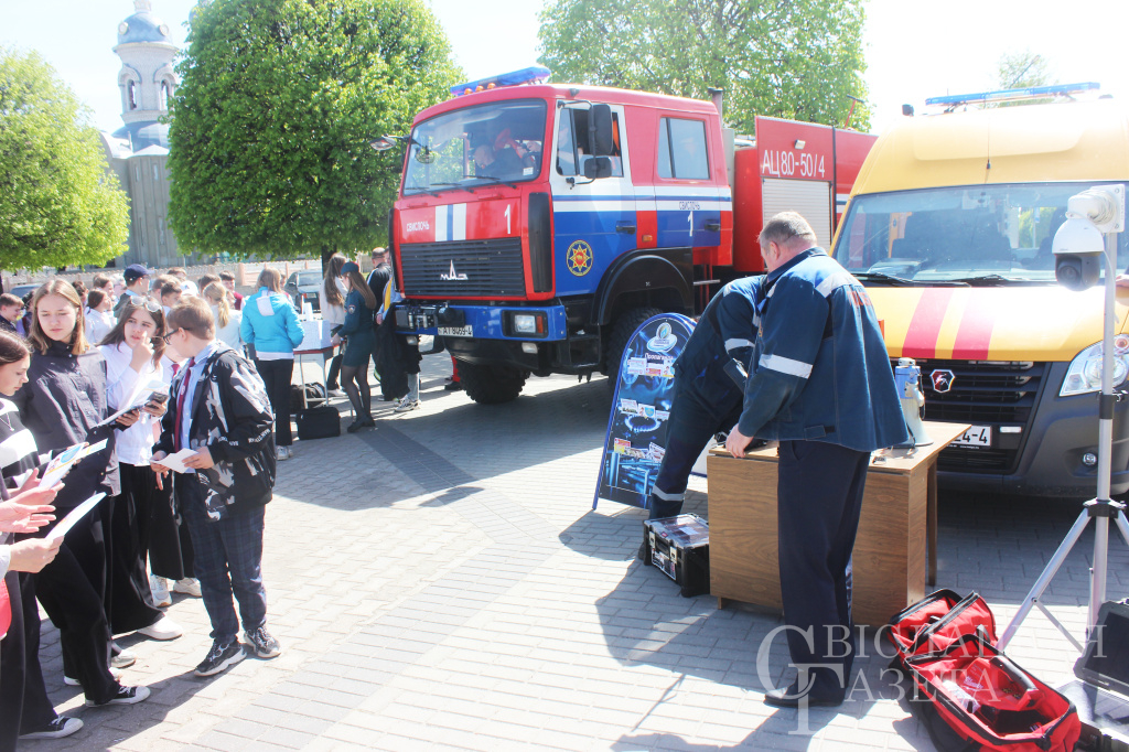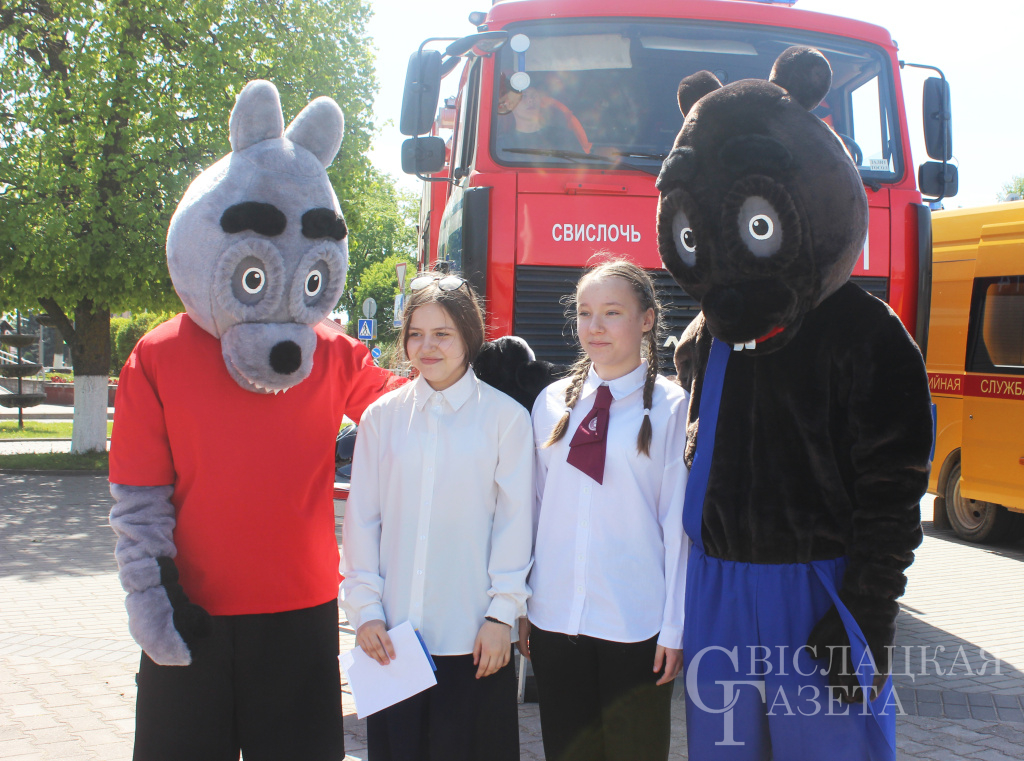 На центральной площади свислочские спасатели совместно с работниками культуры устроили настоящий праздник для ребят. Девчонки и мальчишки смогли поучаствовать в конкурсах, викторинах и повторить правила безопасности на тематических площадках, организованных спасателями-пожарными и представителями газовой службы.