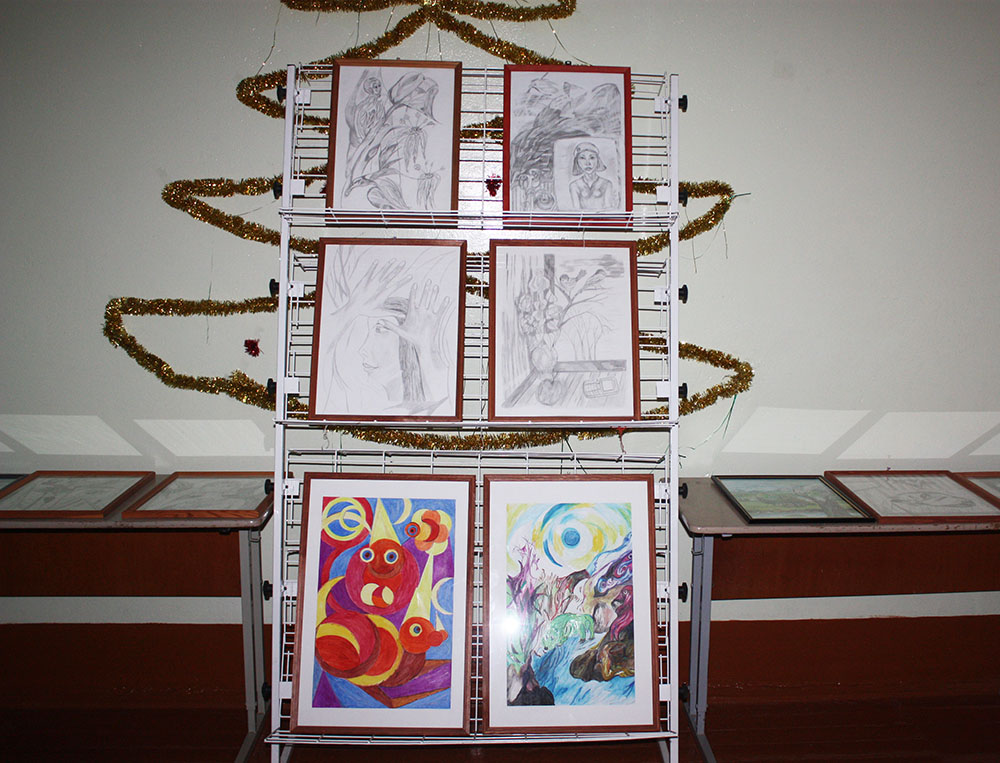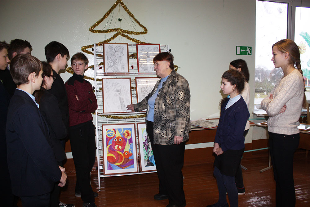 Школьникам художница презентовала выставку картин «Разноцветный мир вокруг». В нее она включила самые различные работы. Много места в экспозиции отдано изображению женщины: «Девушка смотрится в зеркало», «Загадочная женщина», «Леночка», «Свидание», «Любимая», «Девушка под луной». Широко представлены абстракции «Время», «Вселенная», «Гейзер», «Инопланетяне», «Свадьба сверчков», «Музыка», «Трансформер». Конечно, имеются и прекрасные пейзажи «Перед грозой», «Старая лодка у забытых камней», «Весна». Есть картины с философской тематикой и различным настроением автора: «После третьей мировой», «Жду звонка», «С добрым утром», «Маска печали и радости», «Розы и бабочки». О каждой из этих картин автор говорила с большой любовью и теплом. Ребята очень внимательно слушали рассказ Людмилы Константиновны, задавали вопросы, восхищались ее талантом. Через свое творчество она старается привить любовь к искусству подрастающему поколению.