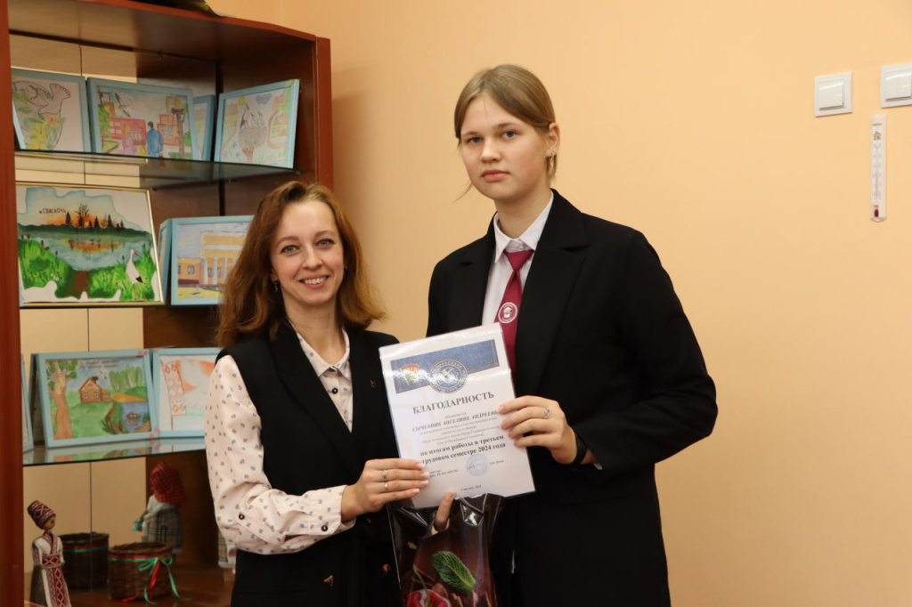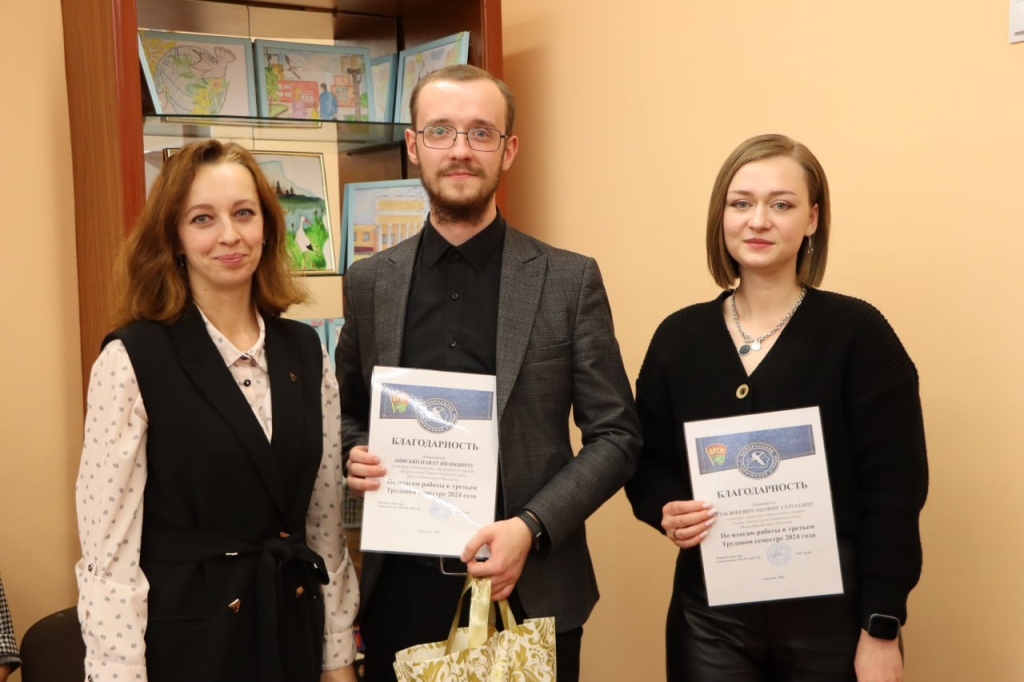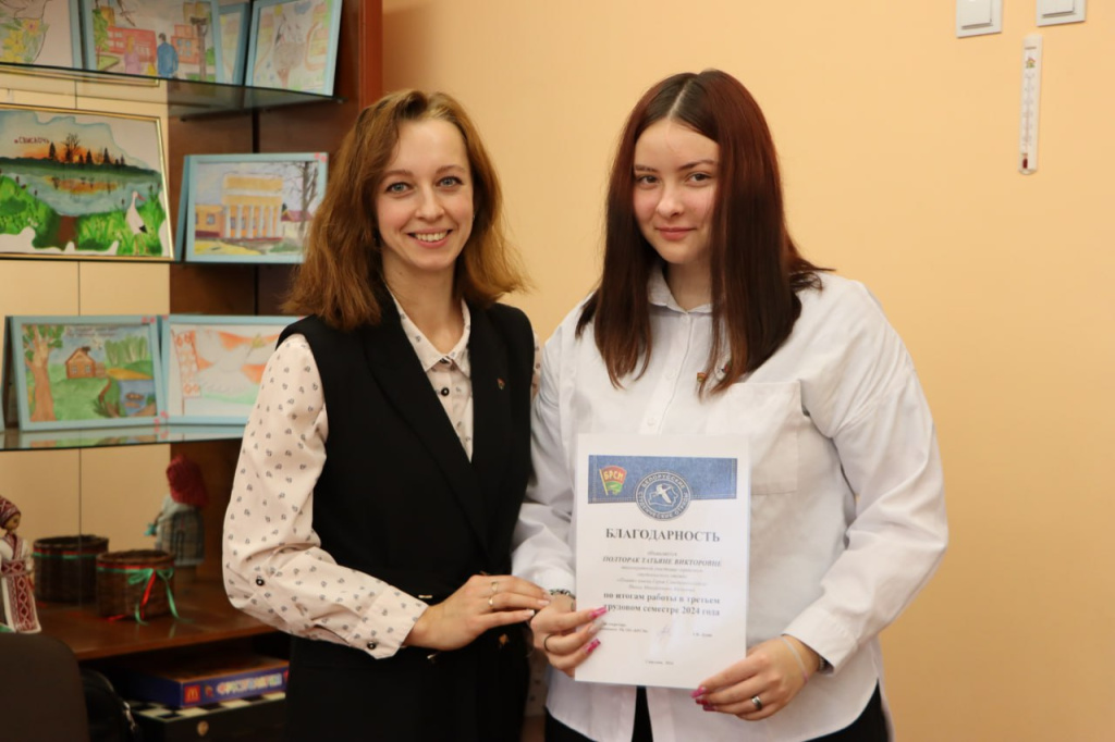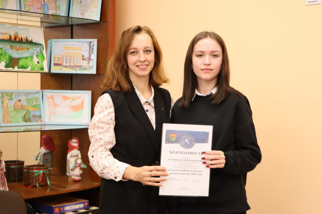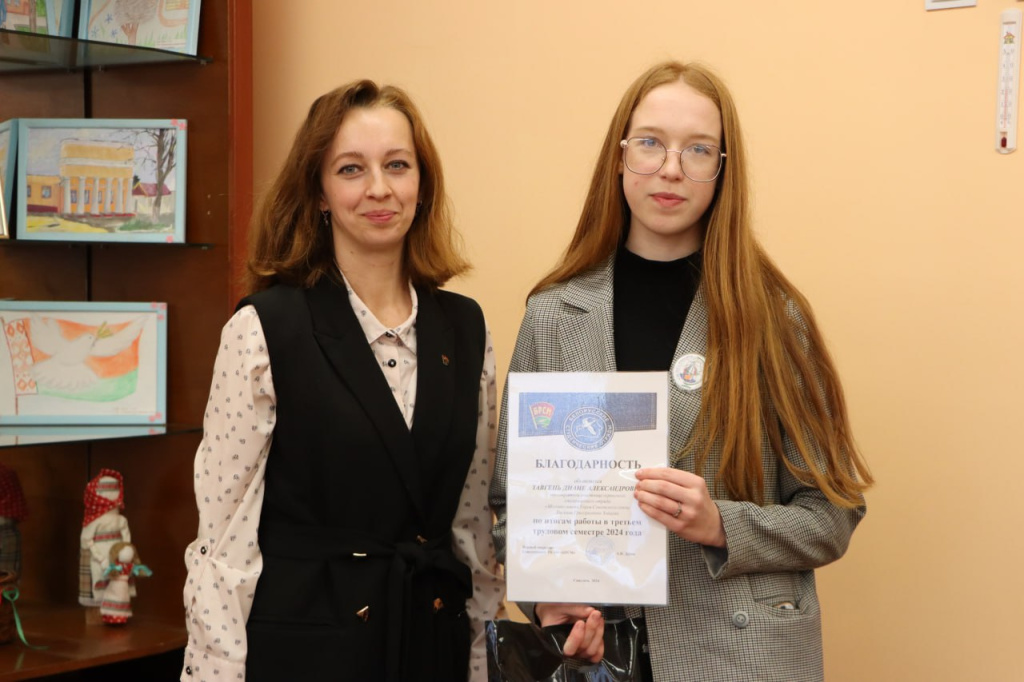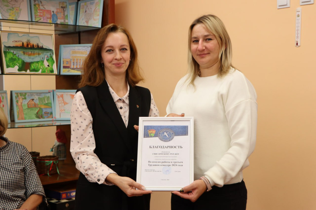 Анастасия Дудак, подводя итоги третьего трудового семестра, поощрила самых активных благодарностями и подарками от БРСМ. Так, лучшей принимающей организацией сервисных студотрядов названо Свислочское РУП ЖКХ. Благодарность объявлена командиру экологического студотряда «Искра» имени Героя Советского Союза Н. П. Массонова Павлу Анисько, командиру сервисного студотряда «Пламя» имени Героя Советского Союза И. М. Мельнова Полине Стасюкевич, многократным бойцам студотрядов Софье Ковалевской, Диане Тавгень, Софии Будницкой, Ангелине Сычевник, Татьяне Полторак, Михаилу Данильчику.