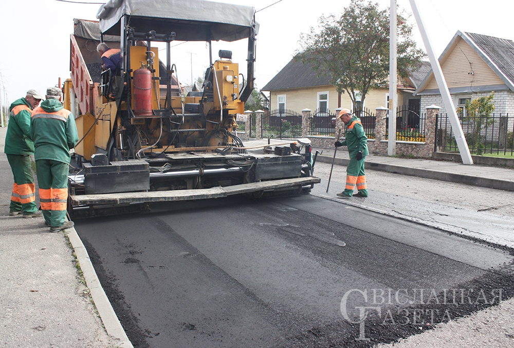 За два дня дорожники планируют выровнять дорожное покрытие. А когда придет отсев, начнут укладывать второй слой. Отсев – это компонент состава асфальта, который применяется при укладке верхнего слоя покрытия. Его поставляет республиканское предприятие «Гранит», что в Микашевичах. На ремонте дорожного покрытия задействованы 2 катка, асфальтоукладчик, 2 грузовых автомобиля МАЗ. На помощь нашим дорожникам пришла и специальная техника из Мостов – автогудронатор. Машина поливает специальной эмульсией старое покрытие, тем самым скрепляя его с новым.