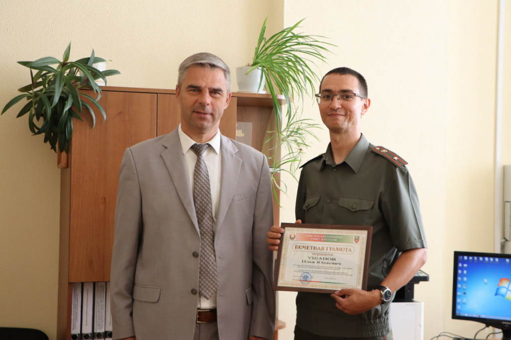 За значительный личный вклад в укрепление обороноспособности Республики Беларусь и патриотическое воспитание подрастающего поколения Почетные грамоты Свислочского районного Совета депутатов вручены начальнику обособленной группы Илье Ушанову, а также ведущим специалистам Валерьяну Жуку и Татьяне Бебех.