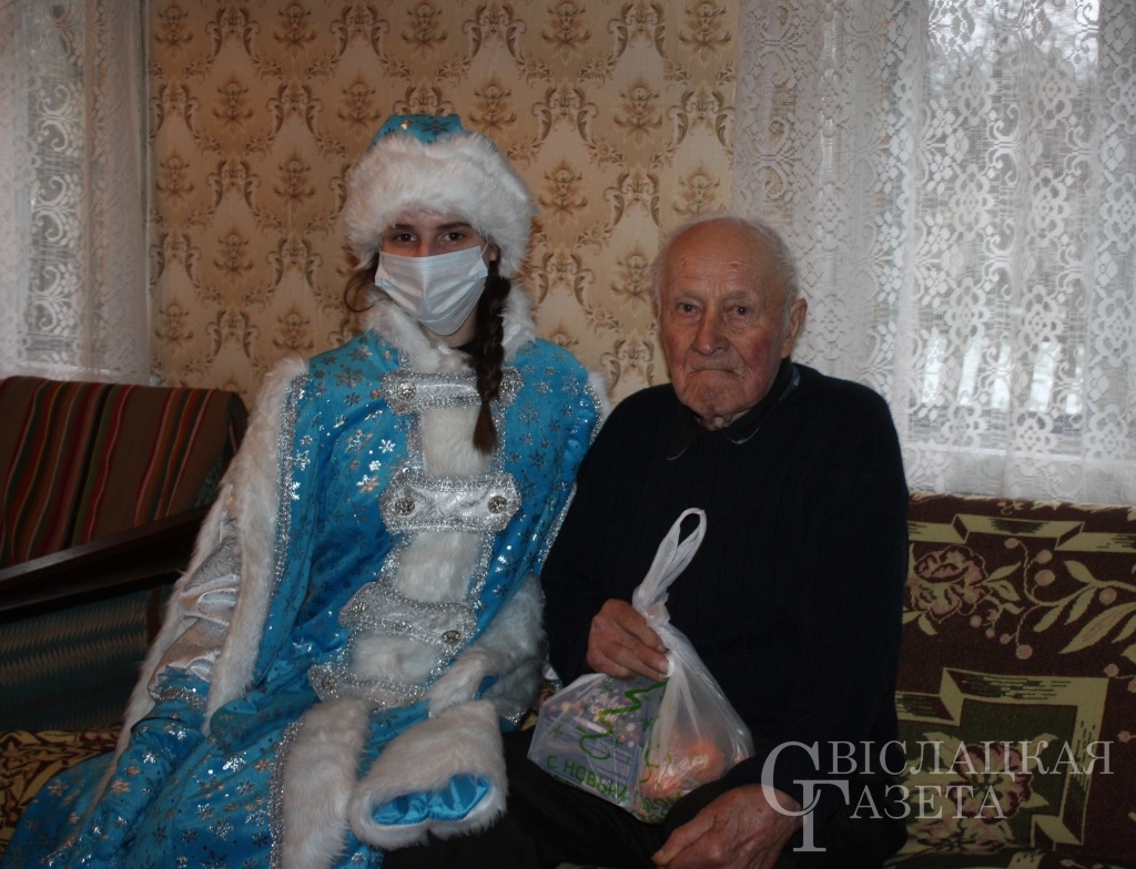 Теплые слова с праздничными поздравлениями и пожелания здоровья, бодрого настроения и крепости духа услышали ветераны от Светланы Сергеевны и Елены Владимировны. Новогодние подарки с мандаринами и сладостями в рамках акции вручала Снегурочка – молодой специалист районного центра культуры Маргарита Харченко. Принимали поздравления и подарки Антон Антонович Тарасевич из Свислочи и Иосиф Иванович Казимирчик из Больших Бобровников. Конечно, не забыли и Степана Макаровича Жилевского, который гостит сейчас в Минске у сына. Получил подарок и Николай Иванович Шостак. Пожилого человека тепло поздравила Снегурочка.