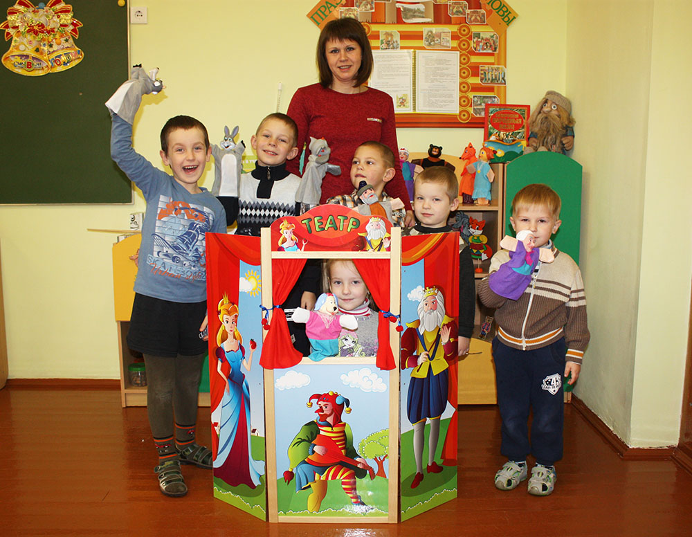 Куток у групе прадстаўлены абсталяваннем для разыгравання сцэнак і спектакляў: наборы лялек, шырмы для лялечнага тэатра, касцюмы, маскі, тэатральныя атрыбуты. Таксама створаны розныя віды тэатраў: лялечны, лапатак, пальчыкавы, на прышчэпках.