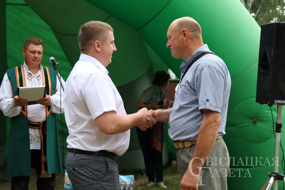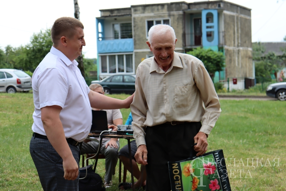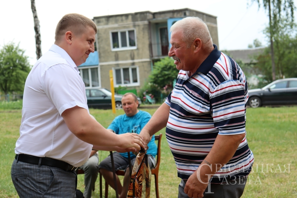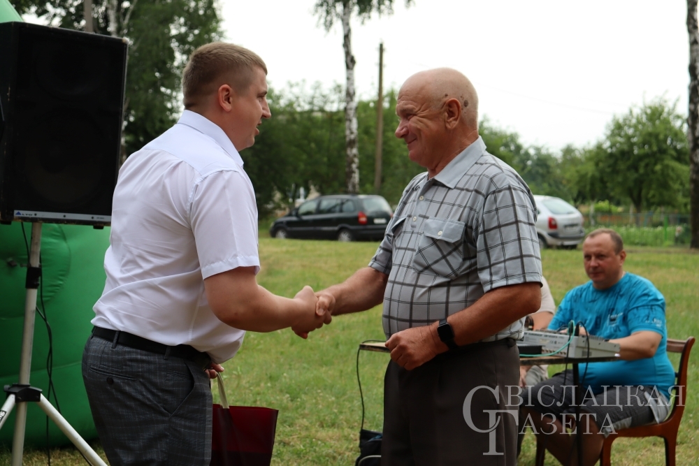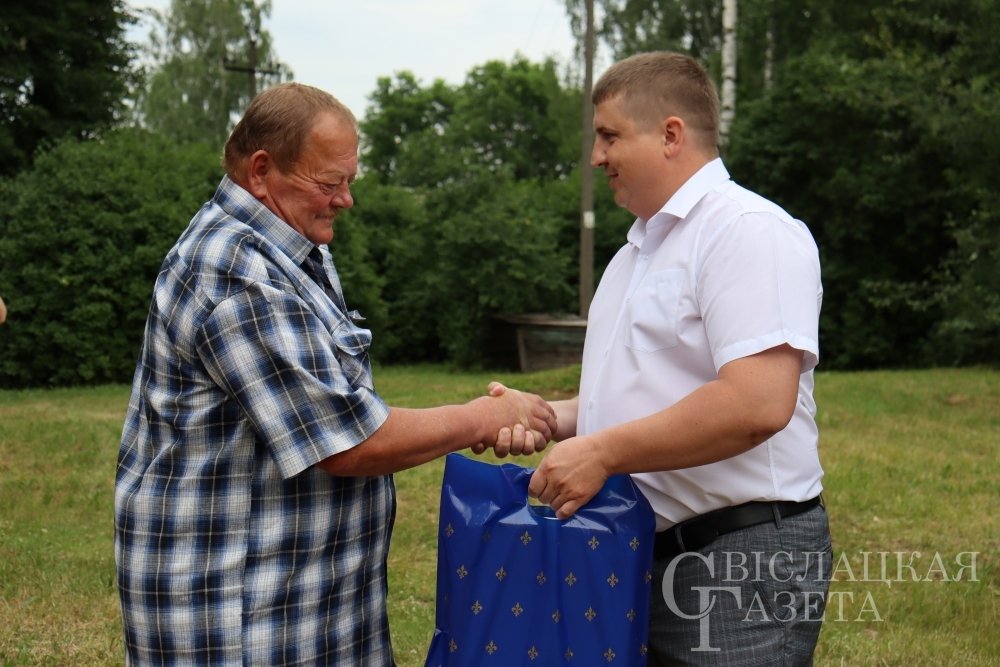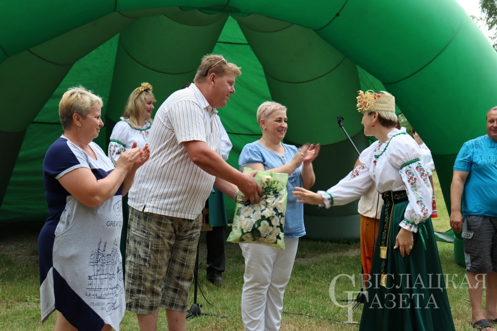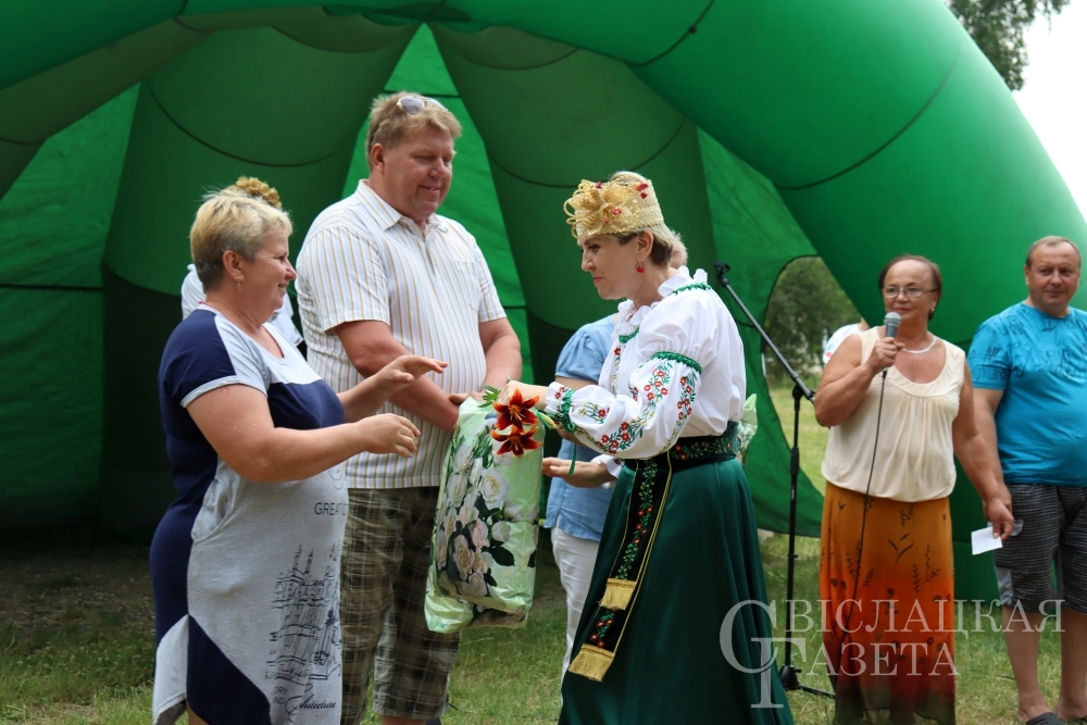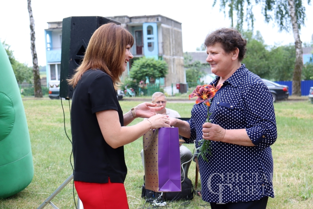 Для поздравления сельчан и награждения коллег по творческому цеху была приглашена Надежда Карпюк. По поручению администрации Свислочского центра культуры и народного творчества Надежда Николаевна позвала для вручения подарков Игоря Швецова, Марину Мацкевич, Ирину Штоп, Татьяну Вербицкую.