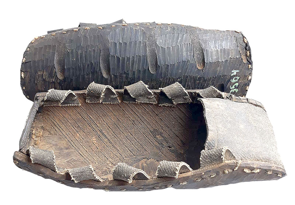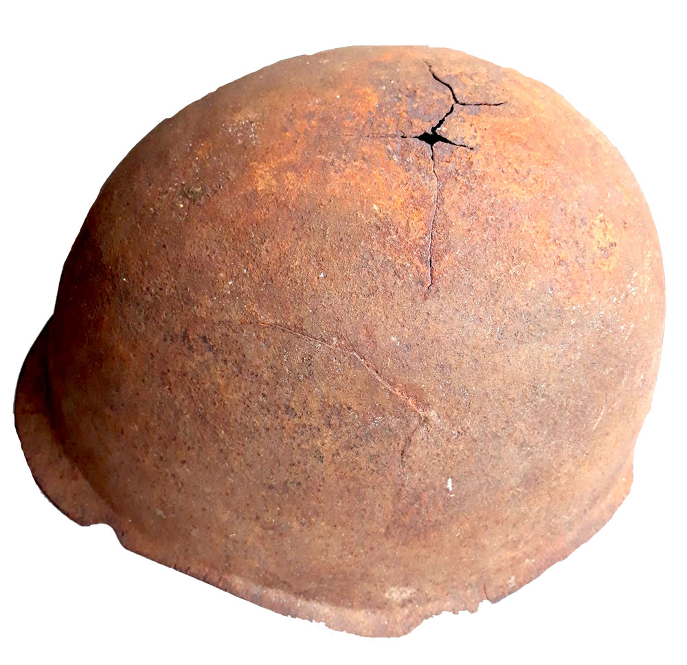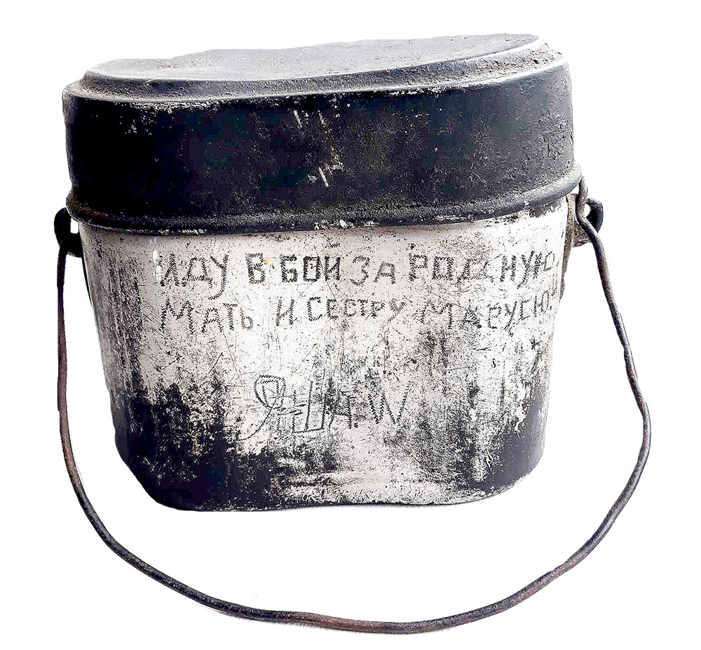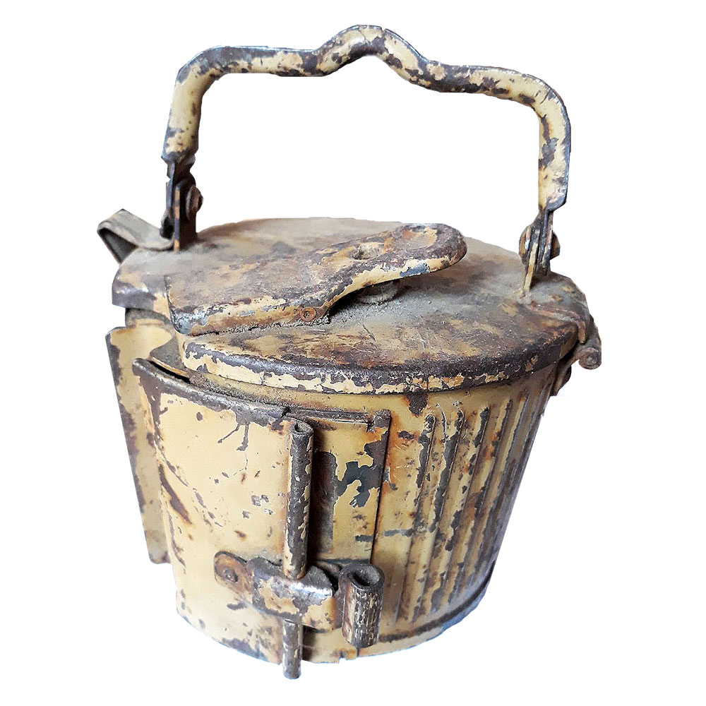 А гэта трафейны экспанат – барабанны магазін для нямецкага ўніверсальнага кулямёта ў выглядзе сечанага бляшанага конуса, так называемы «кекс». Яго ўмяшчальнасць – 50 патронаў.