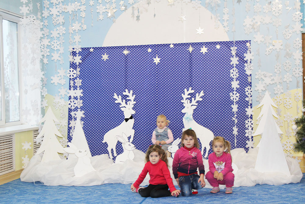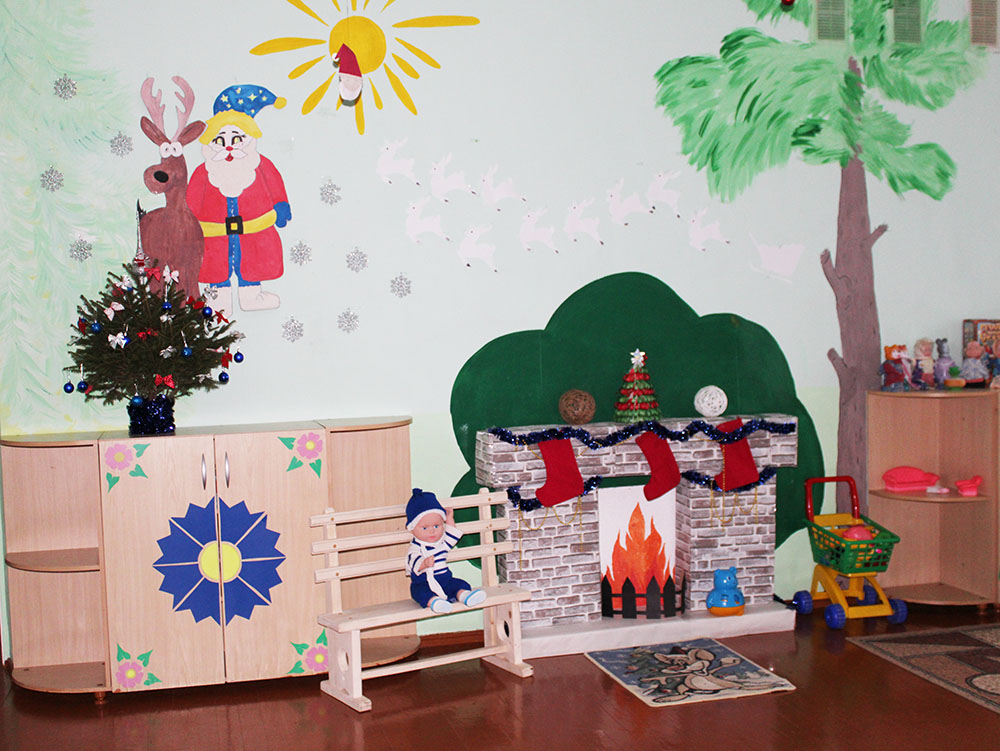 У малодшай групе пры сцяне размясціўся камін са святочнымі мяшочкамі, у якія Дед Мароз пакладзе падарункі для выхаванцаў. Каля яго стаіць лавачка, выконваючая навагоднія пажаданні. Дзяцей старэйшай групы сустракае вясёлы снегавік Олаф і запрашае з ім сфатаграфавацца, а на лесвічнай пляцоўцы чакае цэлая сямейка пацешных снегавікоў. Поручні ўсходаў упрыгожаны букетамі з туі, сасны і сняжынак.