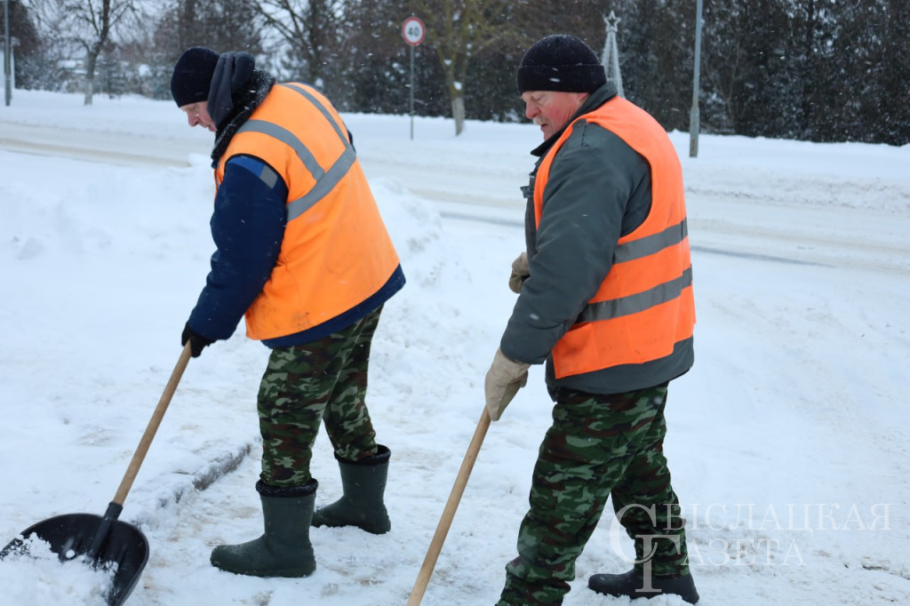 По улице Цагельник расчищали тротуары от снега работники коммунальной службы Андрей Ламашкевич, Сергей Янецкий и Сергей Гуштын. Дело у них спорится, однако снега все прибавляется.