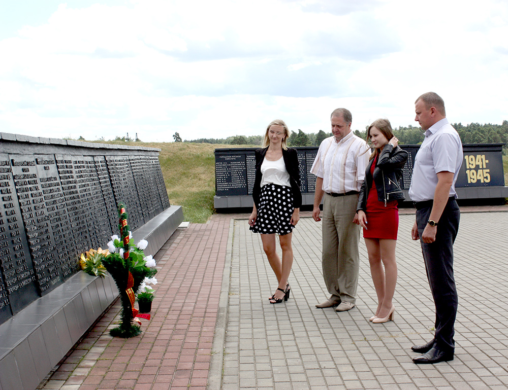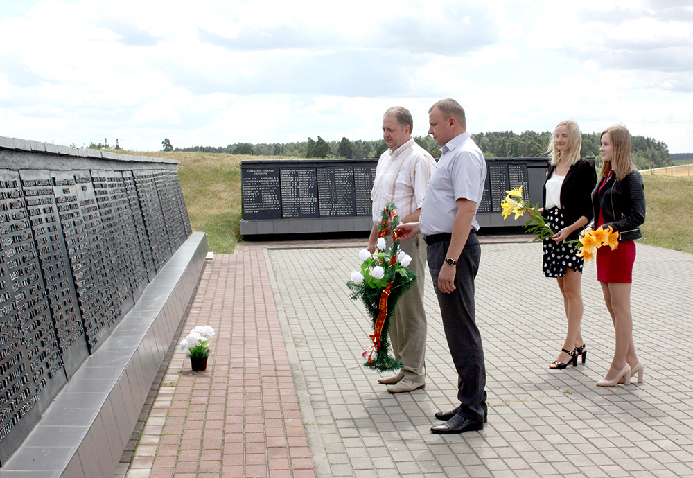 В память о подвиге 1162 земляков, которые погибли от рук немецко-фашистских захватчиков и чьи имена высечены на чугунных досках мемориального комплекса «Асілак», возложили цветы и венок представители Свислочского РЭС.