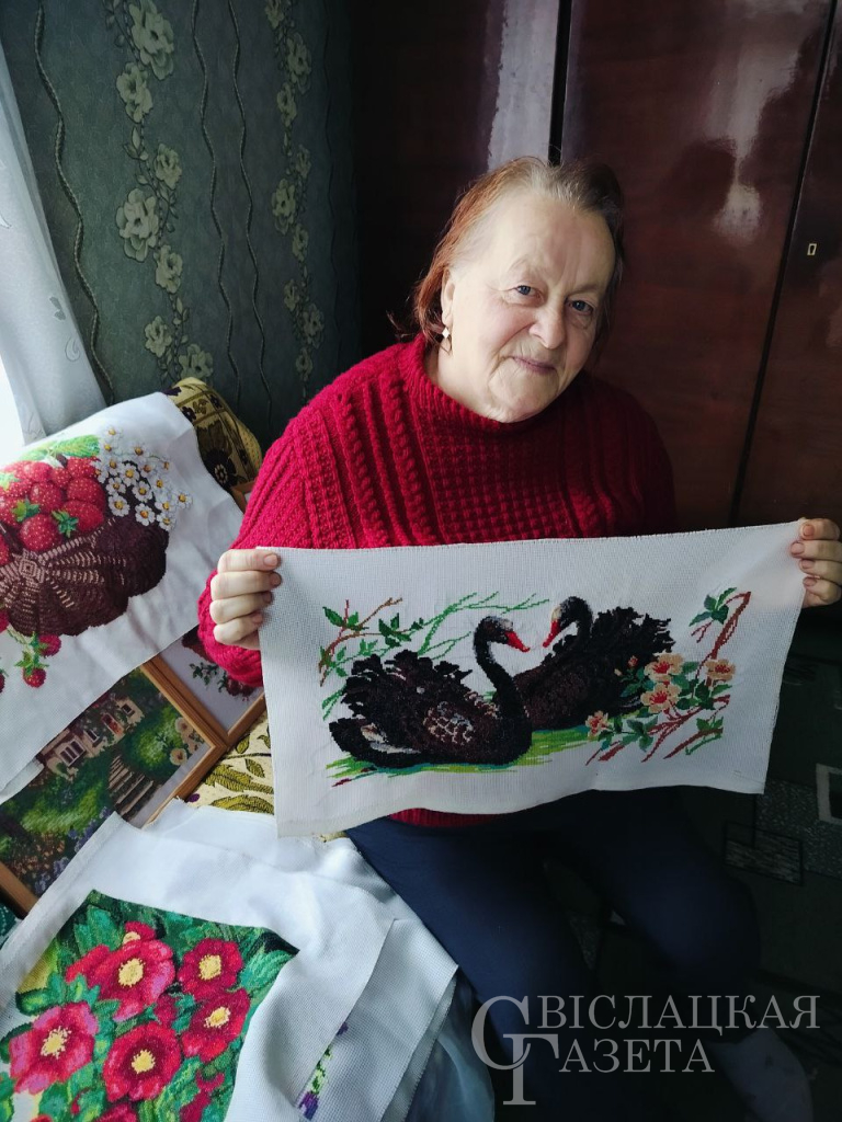 Алена Васільеўна дастае з шафы свае работы. Іх вельмі шмат. Раскладвае па адной на канапе, на стале, і я любуюся імі. Чорныя лебедзі – як жывыя, а клубніцы ў кошыку выглядаюць так апетытна, што хочацца ўзяць у рукі ягадку і паспрабаваць на смак, кветкі – проста цуд! Для сваіх унучак вышыла вясельныя рушнікі. На стале засланы абрус з малюнкам па краі, які прыдумала сама гаспадынька. Цешаць вока тры іконы, якія вышыла бабуля сваім унукам. Іх у Алены Васільеўны трое. Яны – асалода яе сэрца, яе гонар і надзея.