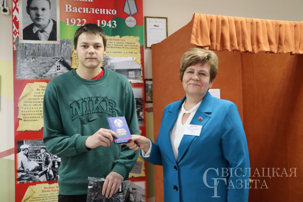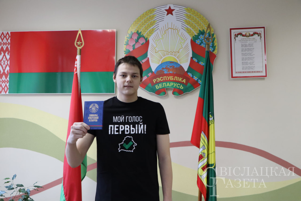 Первый секретарь районного комитета ОО «БРСМ» Анастасия Дудак вручила юноше черную футболку с символичной надписью «Мой голос первый» белорусского производства. Такой подарок, без сомнения, станет для молодого человека добрым напоминанием о важном событии в его жизни.