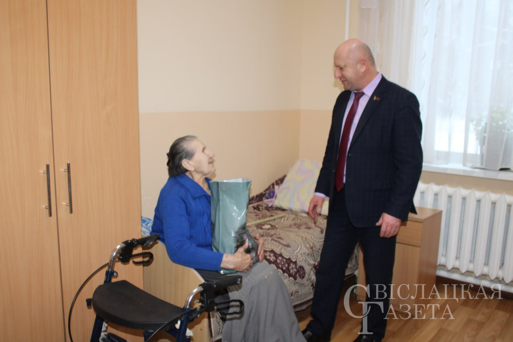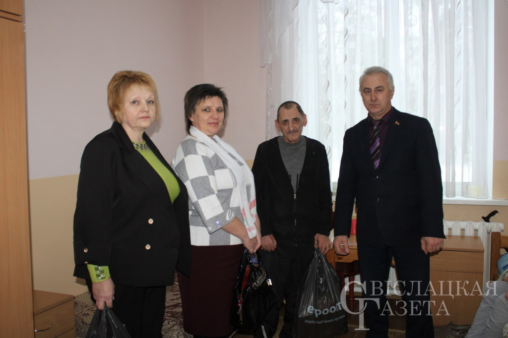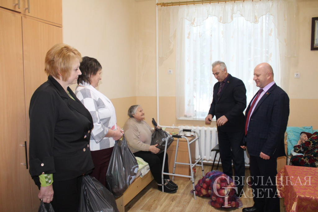 Стариков и старушек, которые многие годы жили и трудились на территориях Порозовского и Хоневичского сельсоветов приехали поздравить их председатели Виктор Акудович и Бронислав Дичковский. Теплые слова благодарности звучали в адрес бывших тружеников села, которые по разным причинам на склоне лет оказались в приюте для одиночества. Им были вручены подарки со сладостями и вкусной сдобой, приобретенные за счет средств, собранных в своих коллективах, а также с помощью Свислочского районного отделения БОО «Спасатель».