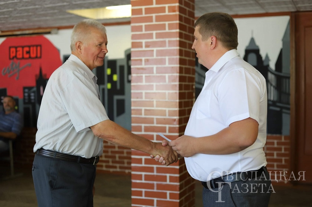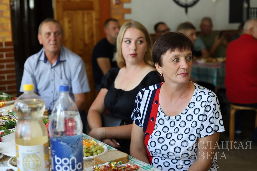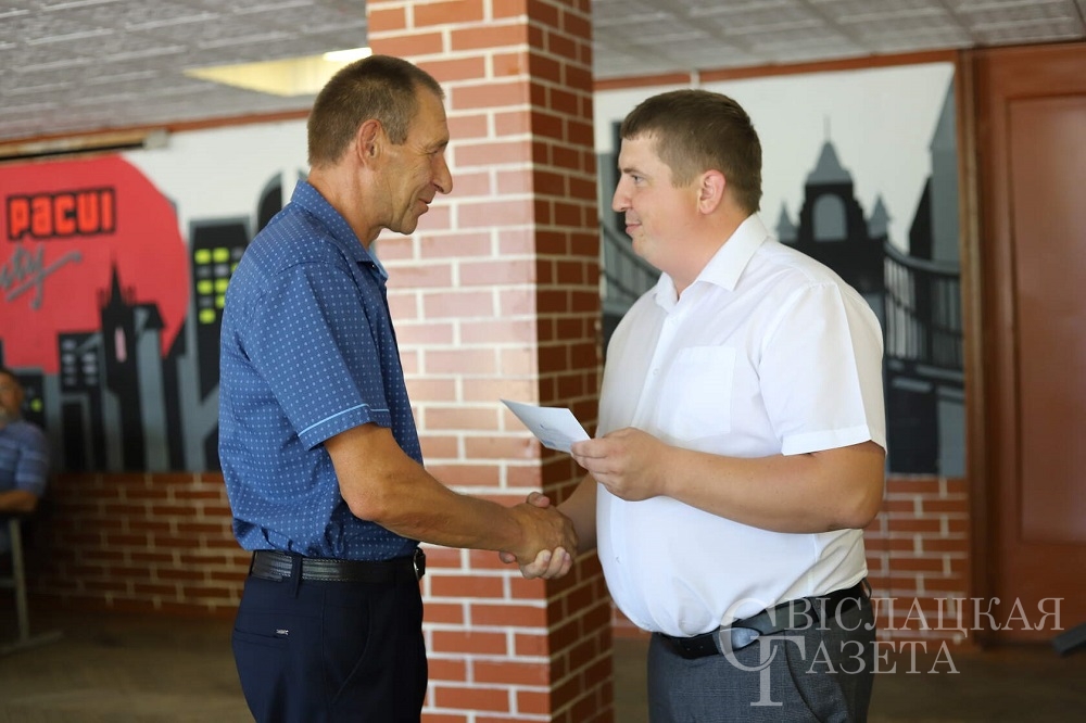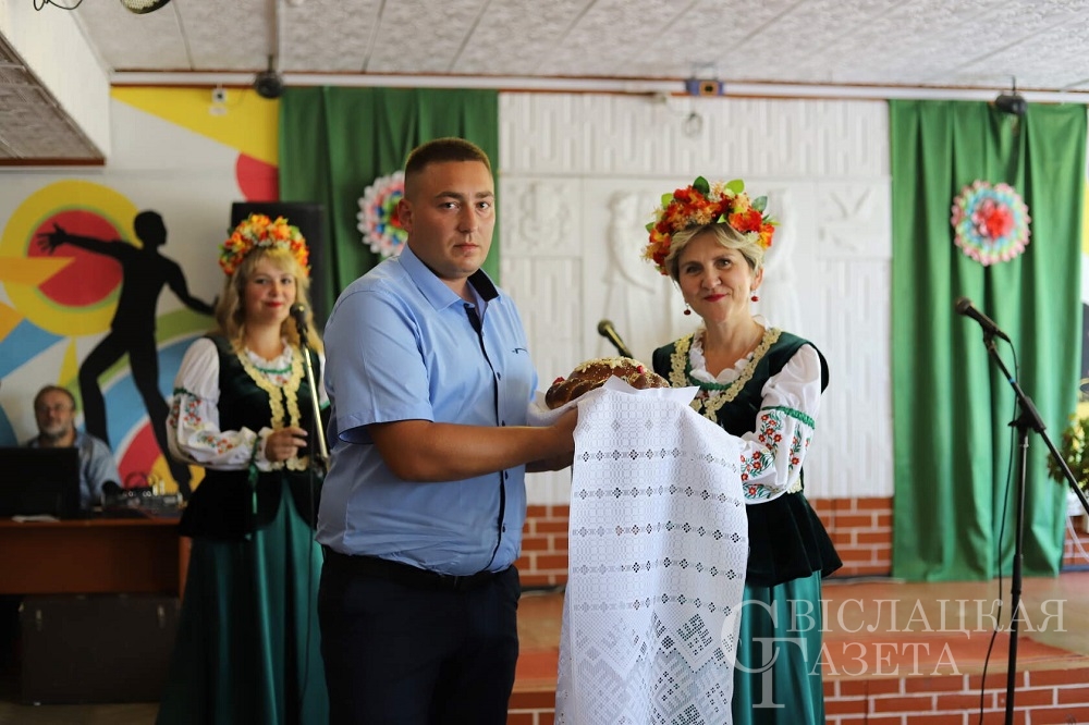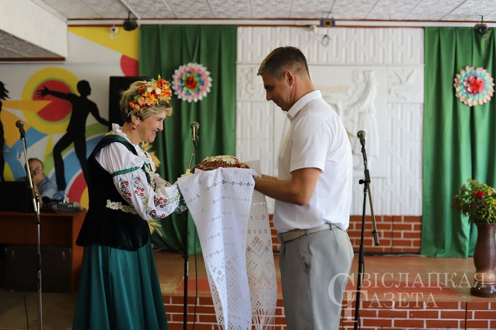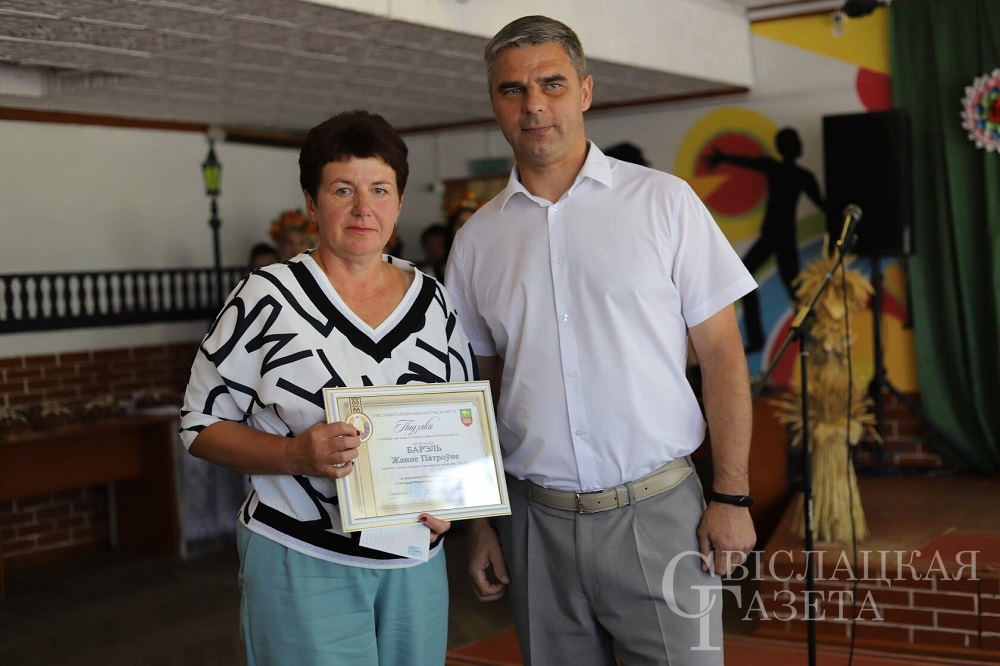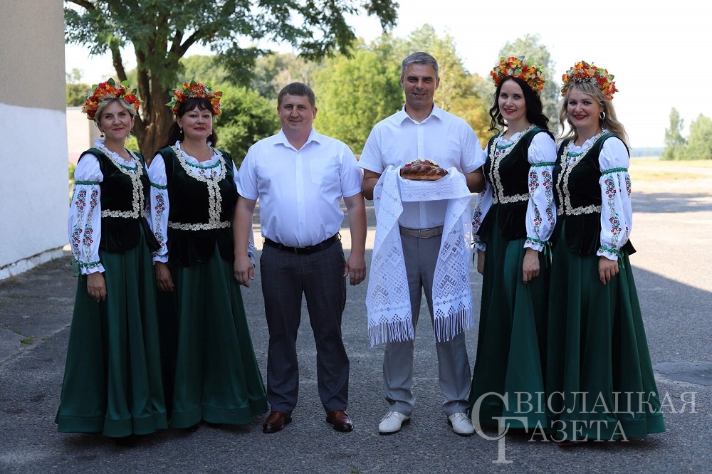 Глава района отметил наградами лучших работников сельхозпредприятия: за многолетний добросовестный труд в сельскохозяйственной отрасли района благодарность председателя райисполкома объявлена трактористу-машинисту Алексею Могила и заведующему складом Жанне Борель. А аграрии в свою очередь преподнесли Александру Людвиговичу каравай нового урожая.
