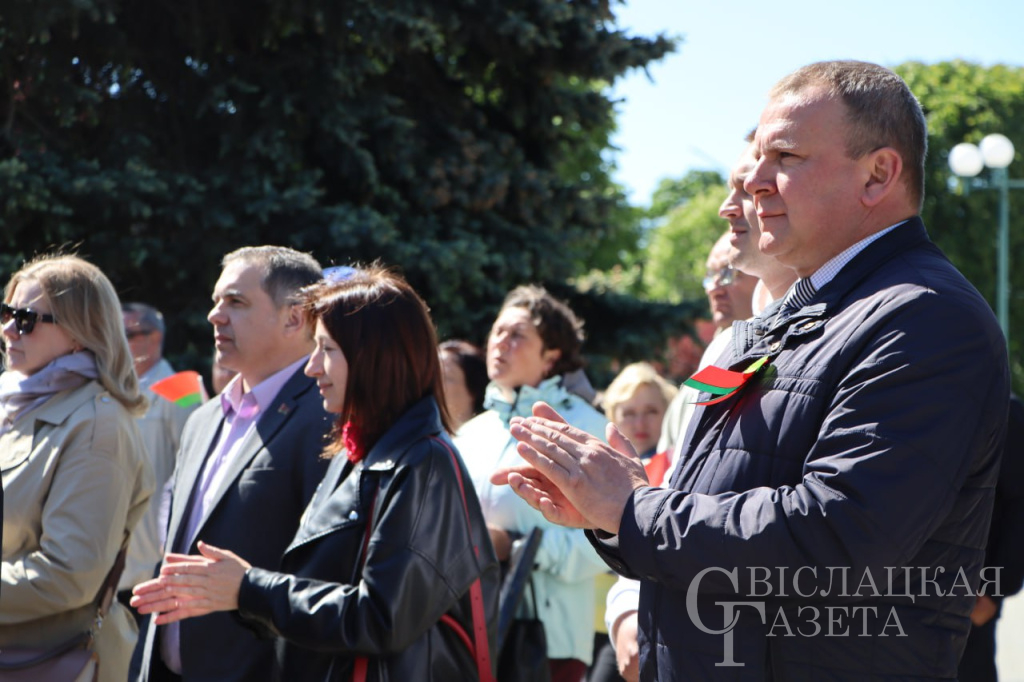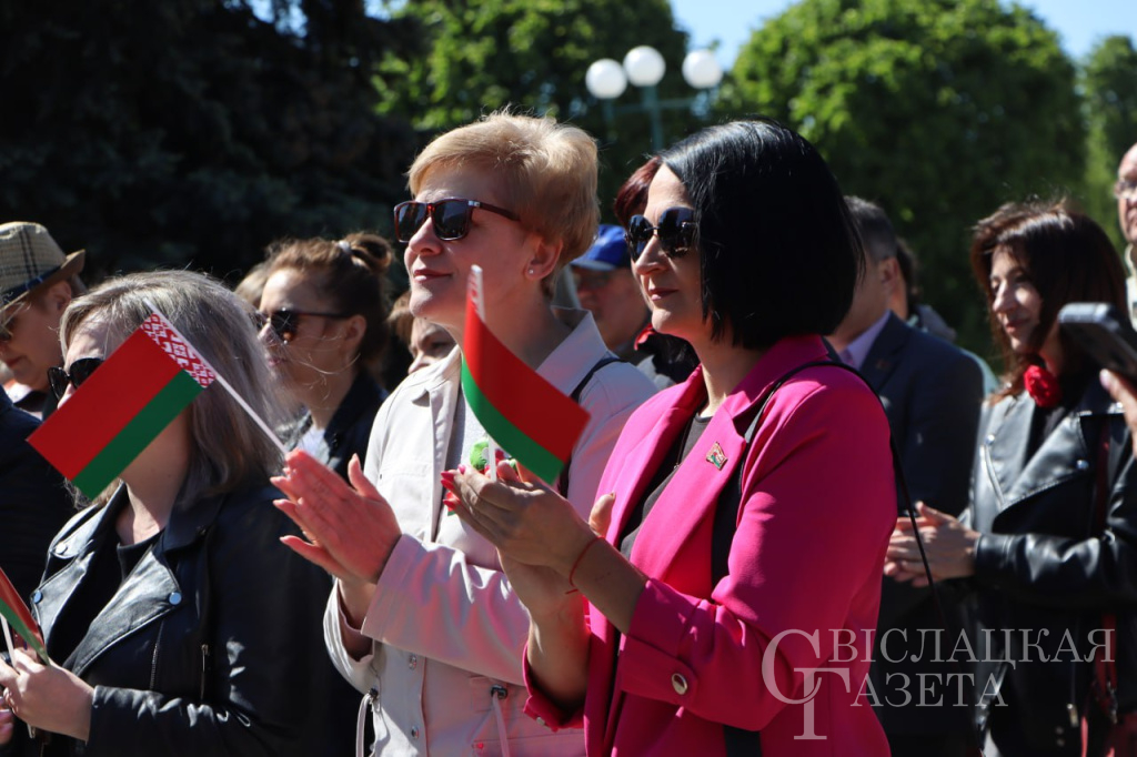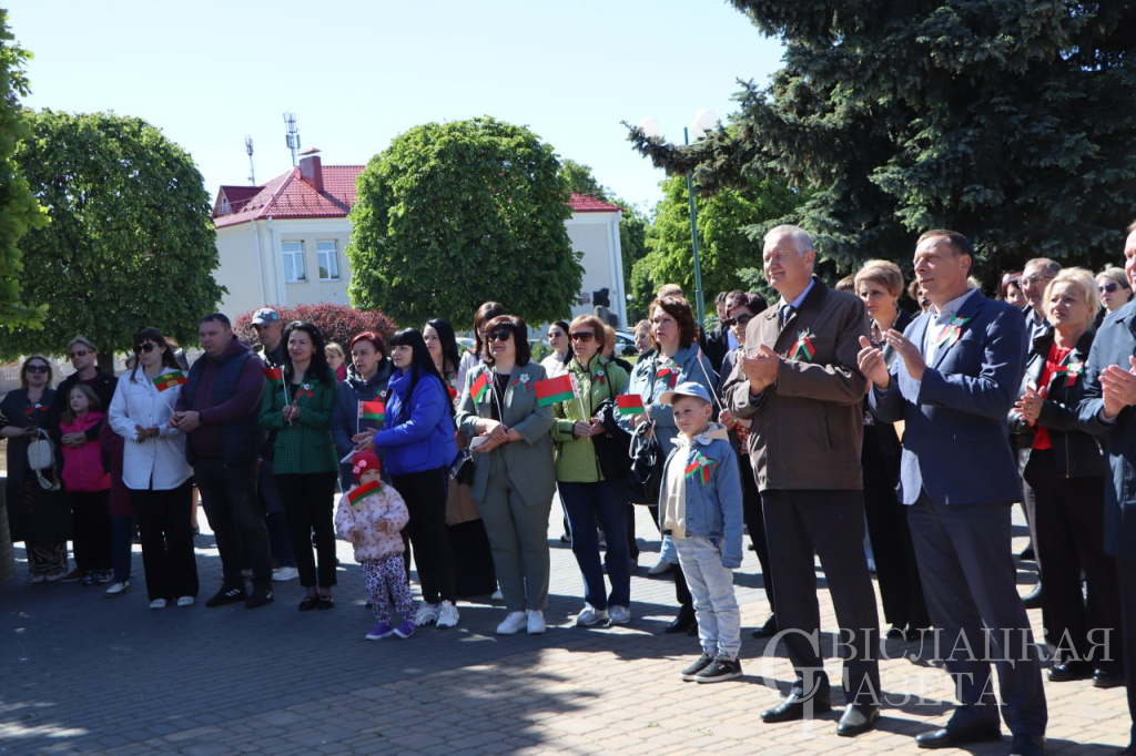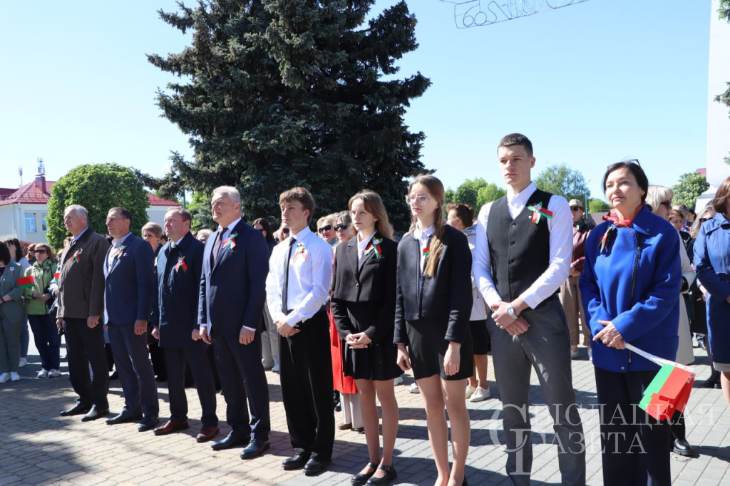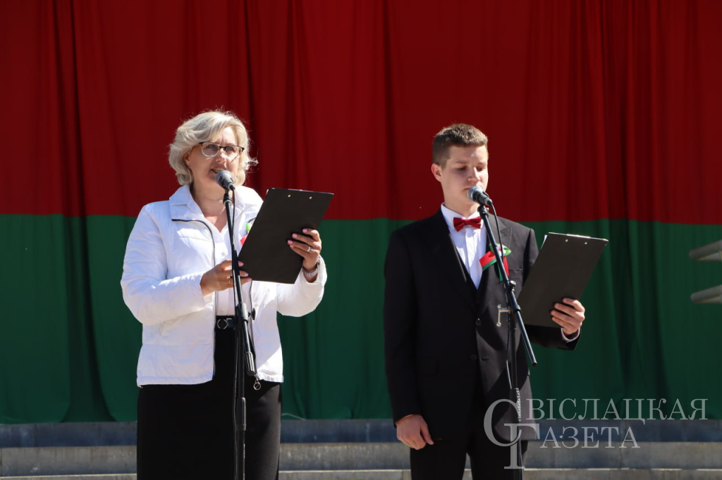 Зазвучал Государственный гимн, и наступил самый торжественный момент праздника. Участники митинга, затаив дыхание, устремляют свой взгляд на красно-зеленое полотнище с орнаментом. Почетного права поднять Государственный флаг удостоены учащиеся СШ № 2 имени Н. П. Массонова г. Свислочи Захар Савко, Елизавета Раецкая, учащиеся гимназии № 1 имени Паши Василенко Екатерина Аксенова и Евгений Калач.