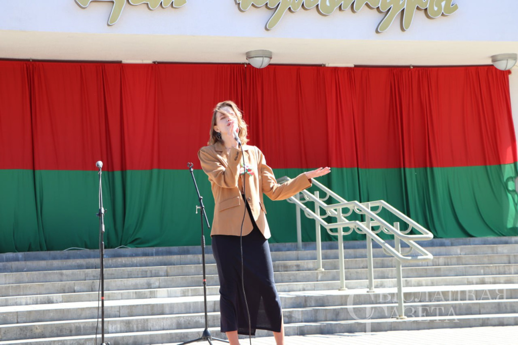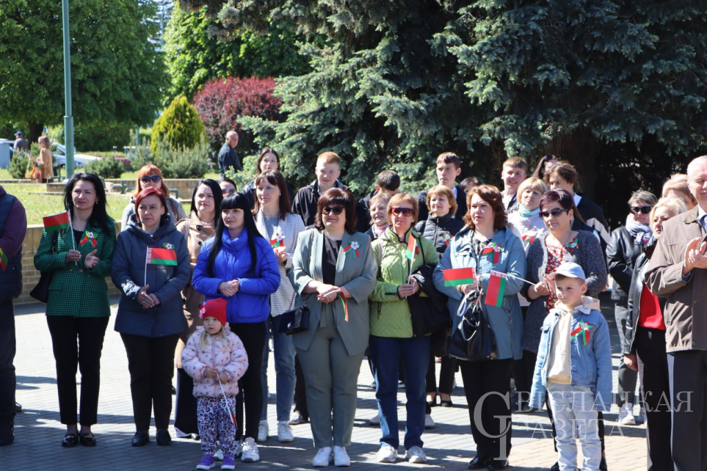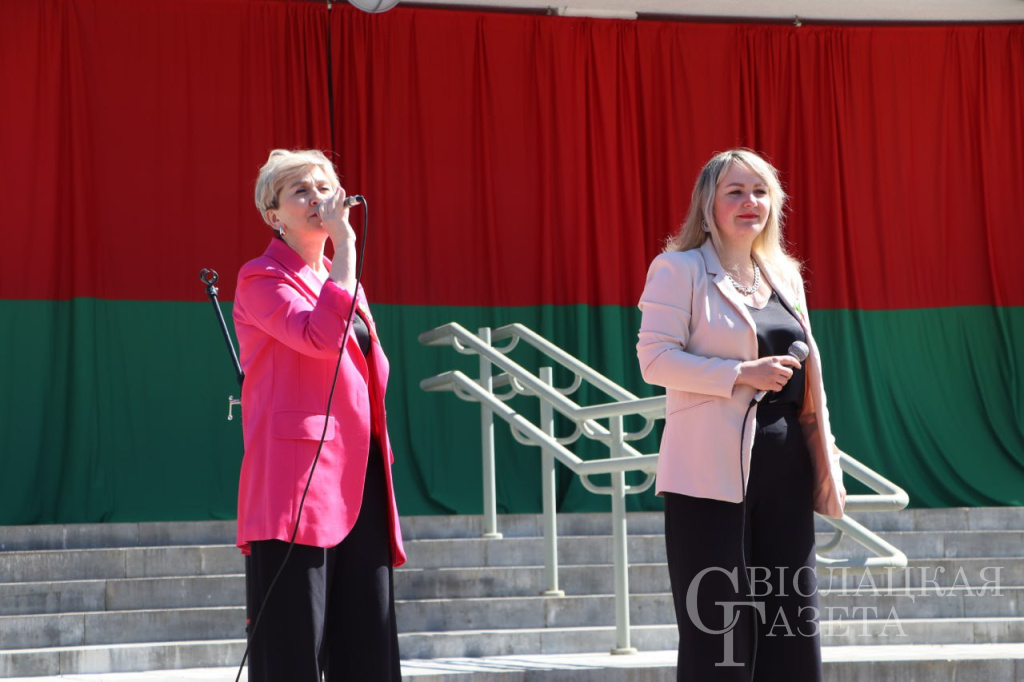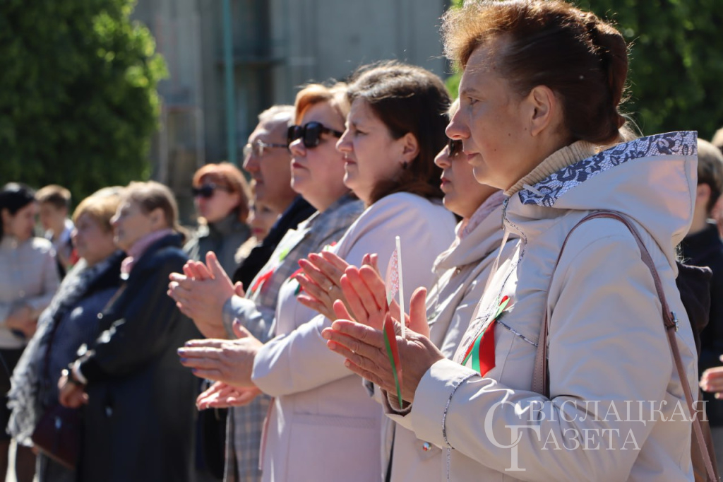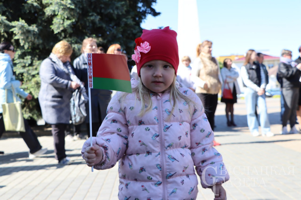 Зазвучал Государственный гимн, и наступил самый торжественный момент праздника. Участники митинга, затаив дыхание, устремляют свой взгляд на красно-зеленое полотнище с орнаментом. Почетного права поднять Государственный флаг удостоены учащиеся СШ № 2 имени Н. П. Массонова г. Свислочи Захар Савко, Елизавета Раецкая, учащиеся гимназии № 1 имени Паши Василенко Екатерина Аксенова и Евгений Калач.