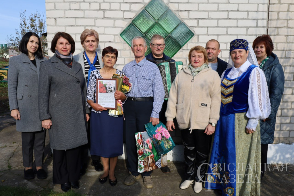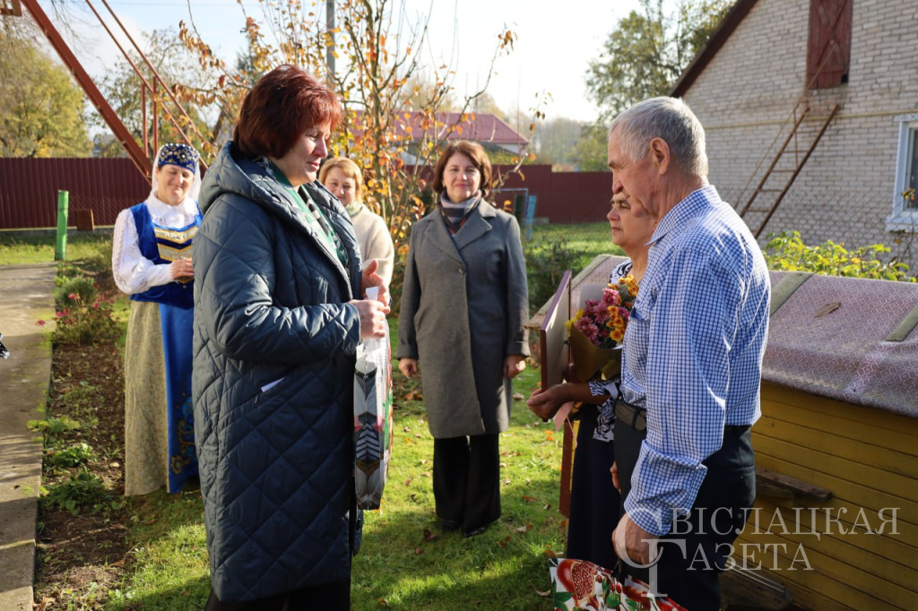Начальник отдела ЗАГС райисполкома Татьяна Супрун зачитывала юбилярам Приветственный адрес от Свислочского райисполкома, вручала подарки от общественного объединения «Белорусский союз женщин». Добрые слова звучали в адрес супругов от председателей сельских Советов, представителя районного профсоюза АПК. А артисты свислочского центра культуры и народного творчества дарили юбилярам песни.