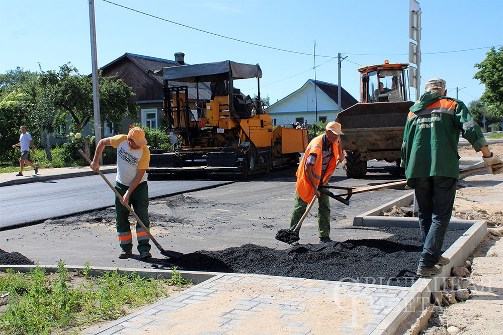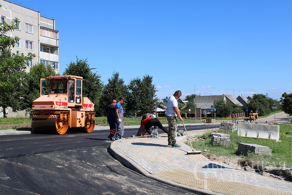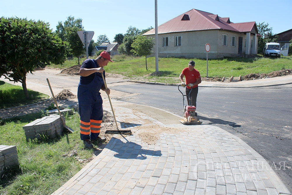 С восьми утра до девяти вечера трудятся работники ДРСУ № 209. Им оказывает помощь в укладке плитки бригада Зельвенского ДРСУ № 118 КУП «Гроднооблдорстрой».