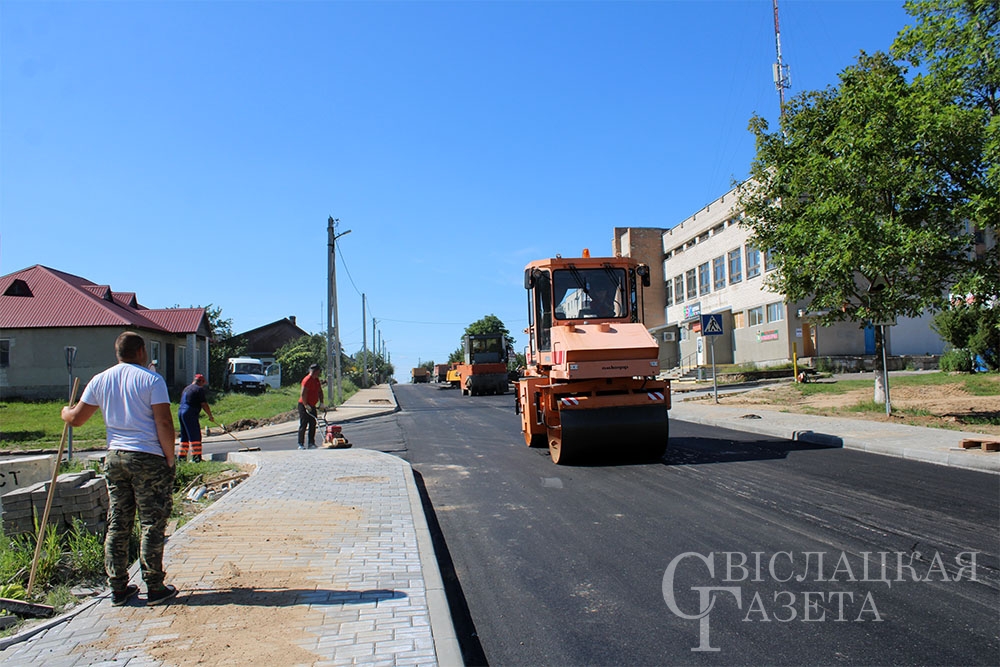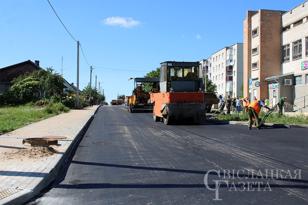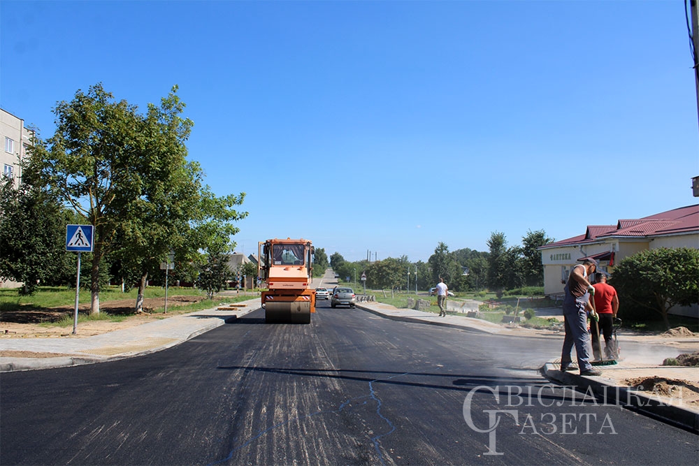 Ремонтные работы ведет Свислочское ДРСУ № 209. Мастер Леонид Янюк рассказал, что сейчас производится укладка верхнего слоя асфальтобетонного покрытия, после будет нанесена дорожная разметка. Также взамен вырубленных деревьев организация высадит шесть новых.