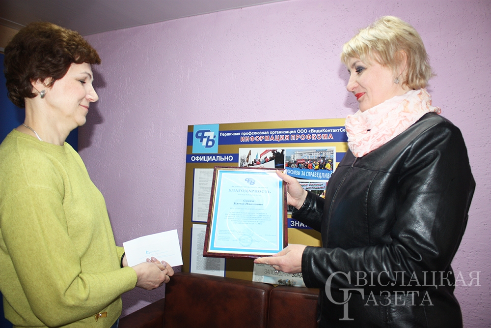 За значительный вклад в развитие и популяризацию профсоюзного движения в Беларуси, плодотворную работу по защите трудовых прав и социально-экономических интересов работников и в связи с праздником Труда профорганизатору первичной профсоюзной организации ООО «ВидиКонтактСервис» Елене Савко вручена благодарность и денежное вознаграждение. Первое поощрение – от районного объединения профсоюзов, второе – от областной организации Белорусского профсоюза работников энергетики, газовой и топливной промышленности.