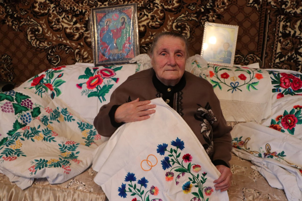 – Я пачала вышываць, калі яшчэ малою была, – дзеліцца ўспамінамі Ганна Сямёнаўна. – Мы тады ў Клеціску жылі. Залезу, бывала, на печ і вышываю. Не сказаць, каб добра атрымлівалася, але жаданне было. Потым ужо не вельмі часу хапала на такі занятак. Замуж пайшла, дзеці нарадзіліся, працаваць трэба было. А вось як на пенсію пайшла, дык на ўсё часу хапала. Спачатку тупала туды-сюды па хаце, не ведала куды сябе падзець. Вясною ды летам на агародзе прападала, кветкамі сваімі займалася, а вось зімою месца сабе знайсці не магла. Вось тады ўзялася за вышыўку. І як другі раз на свет нарадзілася. Ужо зараз палічыць не магу, колькі рушнікоў вышыла, колькі сурвэтак розных, абрусаў, навалачак на вялікія і маленькія падушкі. А яшчэ вельмі люблю вышываць іконы. Іх у мяне таксама шмат. І карцін з прыродай. Гэта мая аддушына. У хаце шмат вы бачылі, а колькі падарыла і дзецям, і родным, і знаёмым. Дачушка Іра, сын Дзіма падтрымліваюць мяне, унукі таксама. Яны мая радасць і святло маёй душы.